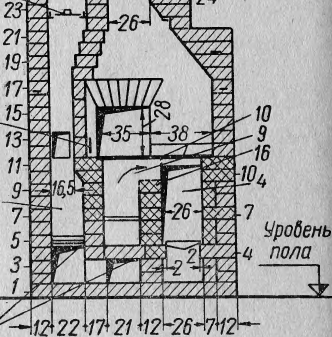Вы обратите внимание, как выполнена кладка внешней стенки печи, при этом внутренняя кладка выполнена стандартно в 1/2 кирпича без пустых швов.