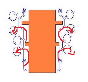 К тому же, вы можете внятно объяснить, какой закон физики может заставить потоки двигаться именно так как вы тут нарисовали? Что заставляет поток поворачивать и прижиматься к стенке печи(помечено красным)? |