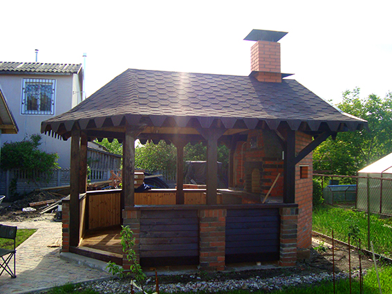 Выкладываю. Чтобы тема не остыла. Почему уличные агрегаты собираем, а потом заказчик после первого дождя начинает какие-то крыши лепить. На улице делаю только по одному принципу: очаг + беседка. В Скетчапе делал проект. Пятигранником беседку ставим.