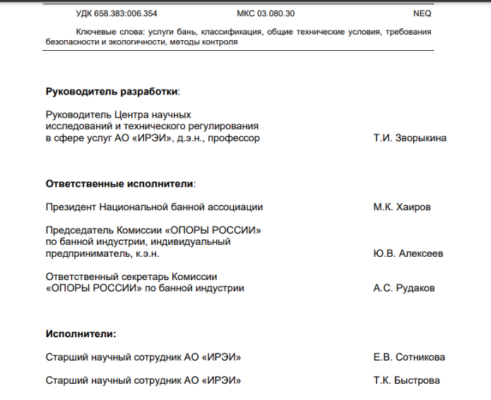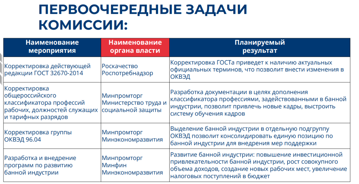 Как я понял из ее презентации, цель корректировки банного ГОСТа – сделать актуальными термины с целью изменения ОКВЭДа .... для последующего внедрения мер поддержки.