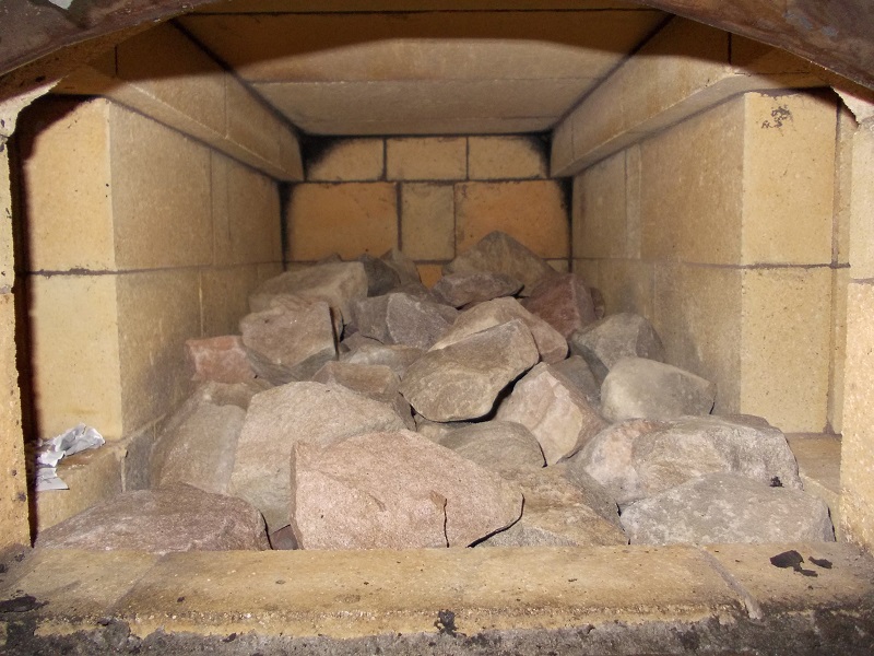 Выложить чугунными ядрами дно каменки. На ядра рекомендуется уложить специальные природные камни для бань и саун (жадеит, порфирит, дунит, хромит, нефрит и другие) в смеси с остатком чугунных ядер (отношение чугуна к камню должно быть ориентировочно 30/70 в пользу природного камня).