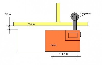 | Ввод желательно бы расположить конечно как можно выше, т.к каменка сама метр в высоту и плюс поворотные углы сендвичтрубы от каменки до печи. |