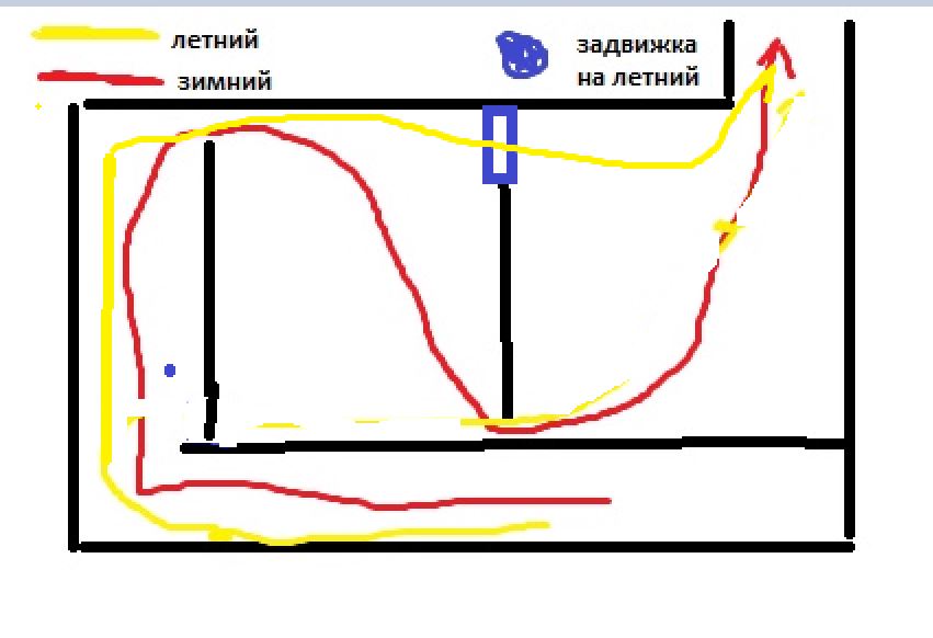 А если на летний ход задвижку если смотреть спереди то поперёк перегородки между 1 и 2 оборотом по низу там далее в трубу останется только колпак сверху не будет мертвКа