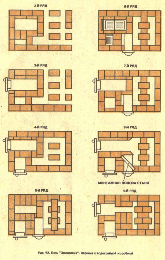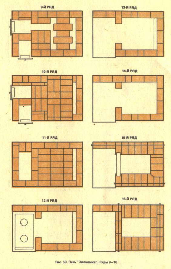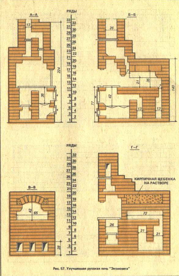 лет 15 назад я, эксплуатируя варочную печь со щитком, влюбился в конструкцию "Экономки" , через 5 лет удалось сложить, правда не самому(сил не хватило и времени - в тот год перестроил дом и в зиму уходил без печи, стекол и полов). Жена после выполнения печи что-то не так сказала - кидался на конструкцию с кувалдой . Сейчас после 10-ти лет эксплуатации никакие варианты не интересуют . Но печь была сложена с толщиной швов местами более 10 мм, черновой стороной кирпича внутрь и т.п. в общем пришло время полной реконструкции. Все эти годы я во всех изданиях и на сайтах просматривал варианты порядовок данной печи и заметил что они везде одинаковые и с массой ошибок в переревязках. К тому же мне надо развернуть выход трубы в противоположную сторону, чтоб присоединить к коренной трубе в щитке камина. В общем скачал уроки проектирования с форума и собираюсь нарисовать самостоятельно. Может Вам встречались нормальные рабочие чертежи данной печи или чего-то подобного в данных габаритах.