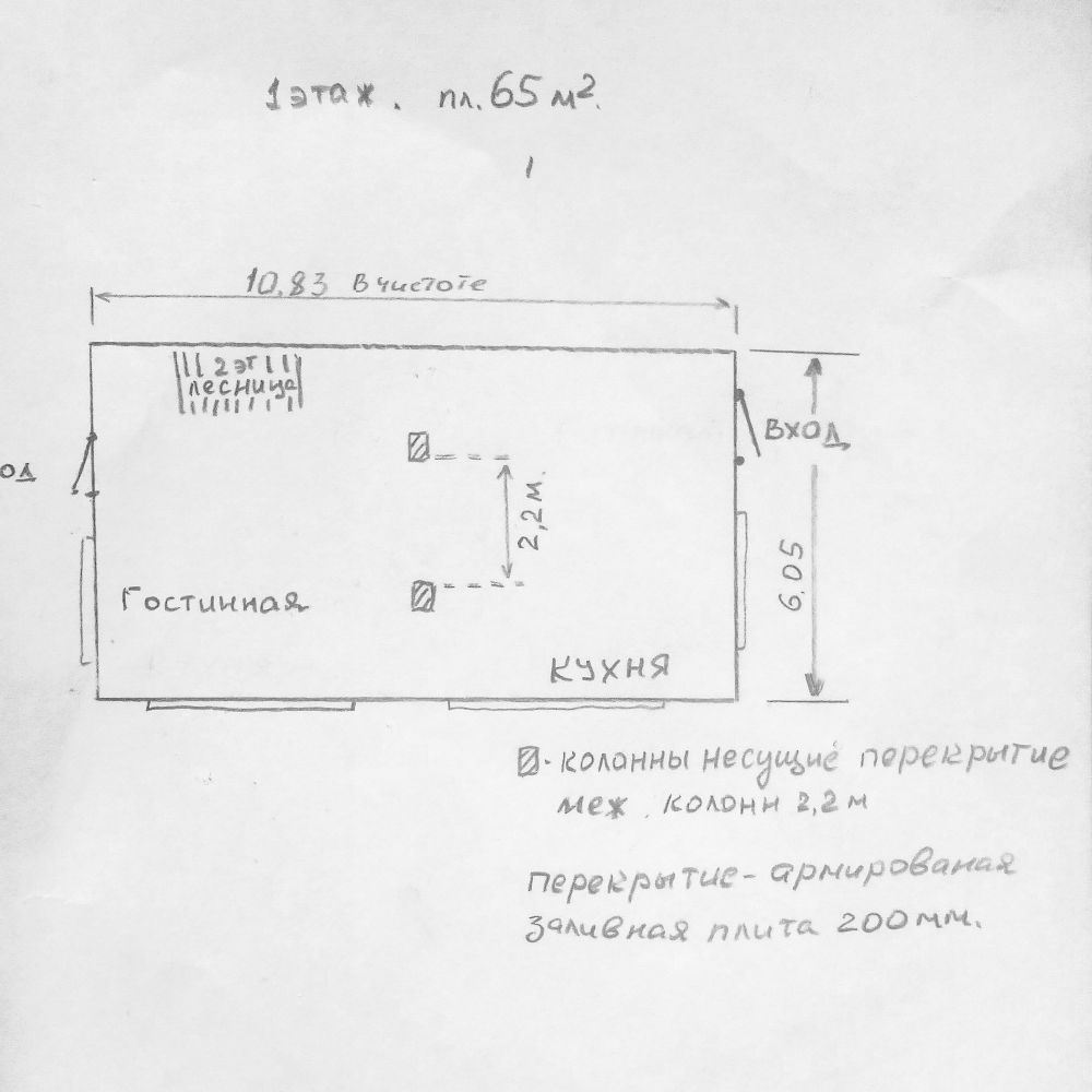 Высота потолка 3 м, хотел бы разместить печь между колоннами в середине дома. Расстояние между ними 2,20 м. |