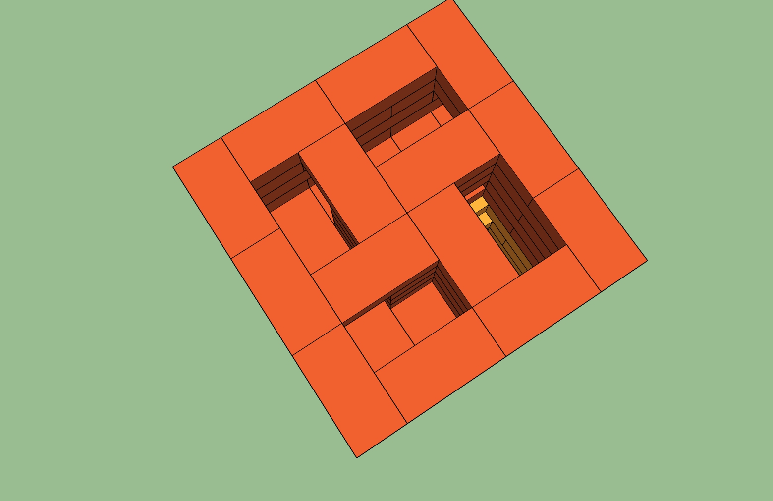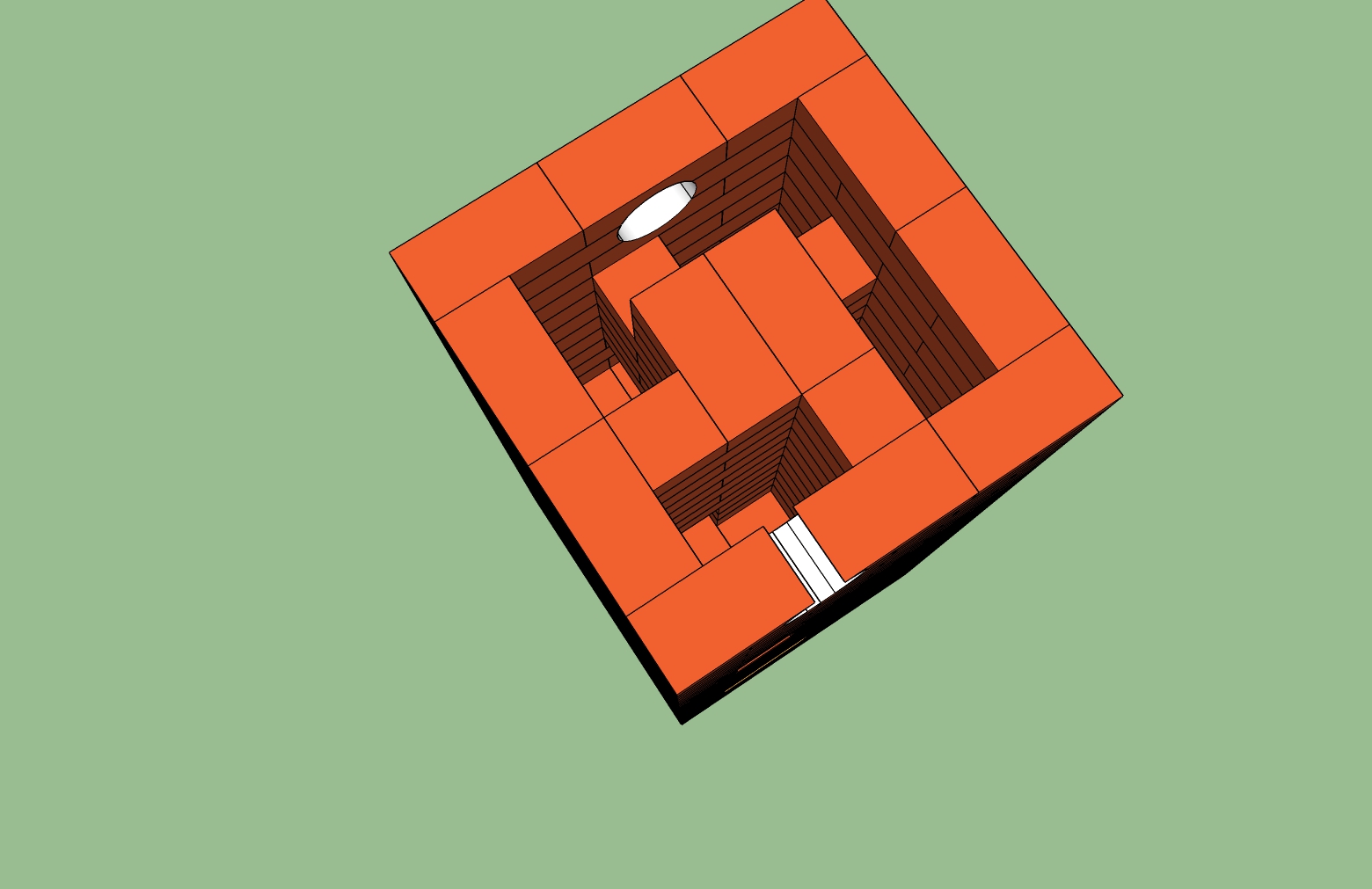 Продолжаю изучать варианты печи для загородного дома и остановился на вариантах от Порфирьева. В его книге есть вариант 770 на 640 и 770 на 770. Больше по размерам подходит 770 на 770 но у него топливник только на один кирпич в глубину. В sketchup сложил нижнюю часть по принципу от малой печи и верхнюю от большой. Вот что получилось. С противоположной стороны подключу буржуйку. Труба - сэндвич с боку (показан над топочной дверцей). Шибер думаю ставить вертикално прямо перед переходом на сэндвичь.