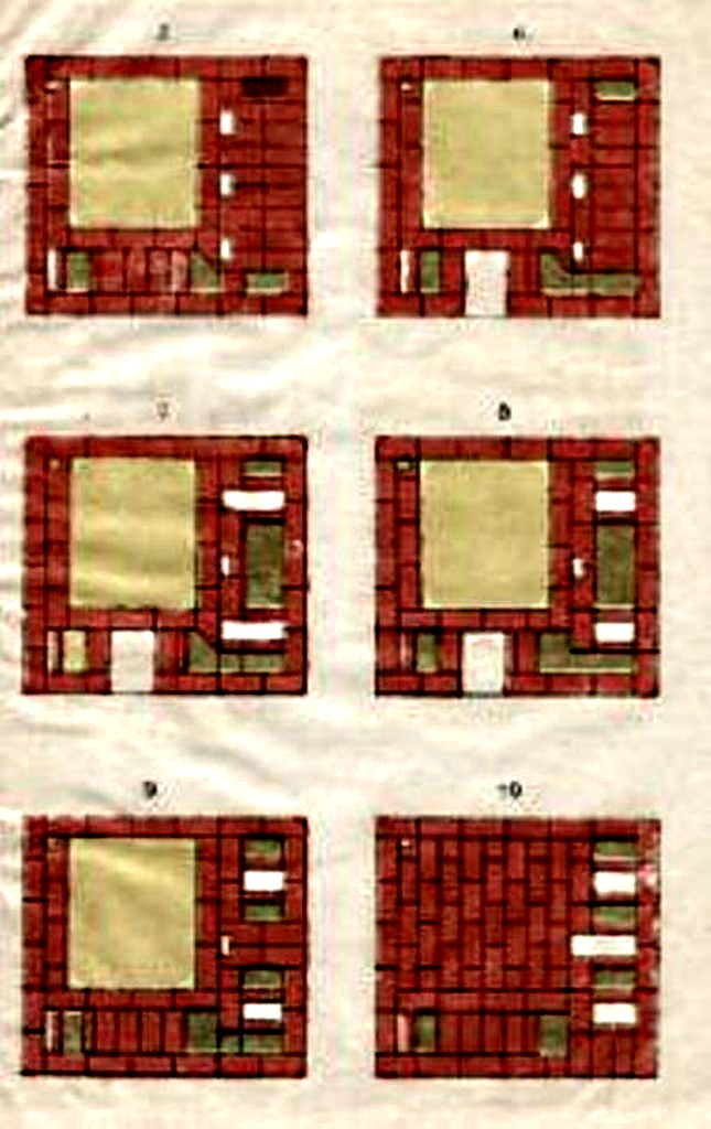 В деревнях не все кирпичные мастера выделывают одинаковый кирпич. Один мастер выделывает кирпич в 6 вершков на 3 вершка и на полтора вершка, другой же вырабатывает кирпич на 5 (3/4) вер., на 2 (3/4) вер. и на 1 (1/2) вер. Поэтому на чертежах размеров печи не показано. Они выйдут в зависимости от того, пошел ли на кладку полномерный или маломерный кирпич. Нужно каждый ряд лишь класть по чертежу.