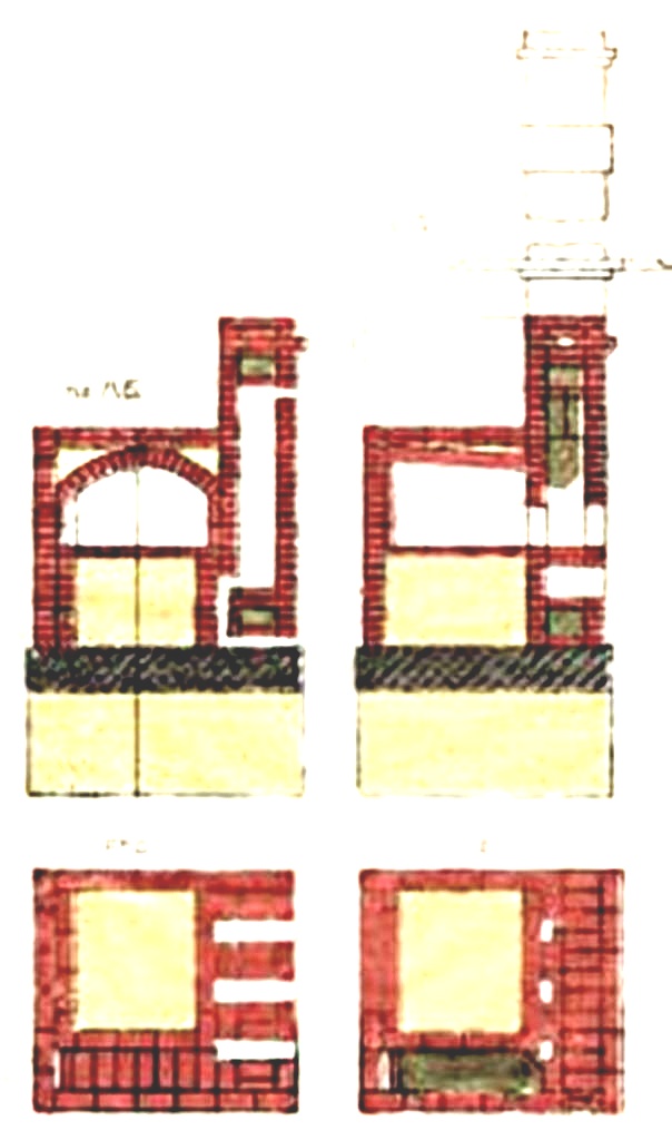 На втором и третьем плане рядов кирпича в лицевой части печи заложены два кирпича на ребро, служащие для закрытия отверстий, через которые время от времени производится чистка дымоходов. Для этого заложенные кирпичи вынимаются, а после прочистки дымохода вновь вставляются.