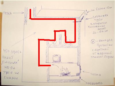 Столкнулся со следующей проблемой. На даче стоит печка уже лет 25. Топится отлично, правда начала немного сыпаться у топочной дверцы, но там сгорели кирпичи. Основная проблема в том, что из трубы идёт черный дым не зависимо от того какими дровами топится. Топил чистой берёзой без бересты, сосной, ёлкой. При растопке дым серенький, а когда дрова разгораются, натурально черный, густой дым. Труба чистая, на стенках нет даже миллиметра сажи. В печке есть два прочистных окна, там тоже регулярно чищу и сажи за год не более 150 гр. Как устроены каналы внутри печки представляю себе слабо, а вернее очень хреновенько представляю. Вот набросал по памяти эскизик. Размеры относительные, но общий принцип надеюсь понятен. Я это всё к тому, что у меня появилась мысль, а не горит ли где-нибудь в каналах сажа, хотя горящей сажей, при топке, дым не пахнет. Знаю, что ещё печники оставляют по кирпичику для чистки каналов, но на печке похожего не нашел. А может просто бывшие хозяева капитально заштукатурили и ни чего не видно. Не могли бы вы намётанным глазом предположить как устроены каналы в этой печке? Особенно меня убивает расположение задвижки. Фото до весны нет, дача далеко, в тайге. Возможно причина черного дыма и не в дымоходе, а в кислороде, но в этом деле я, ребята, не считаю себя профи. Помогите кто чем может!