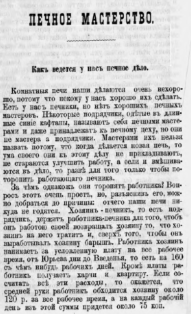 Да и больше ста лет та же проблема -неучей печников и тогда хватало. Заманчиво ведь -денег таких без обучения на заводе либо на крестьянской ферме не заработаешь. А на печном поприще -умную рожу сделал -пару умных фраз запомнил-типа про законы Ньютона- да и давай "капусту стричь". И так же как и больше ста лет назад -всё сходит с рук таким людям. Видать потому что страна необъятная -можно раствориться на необъятных просторах.