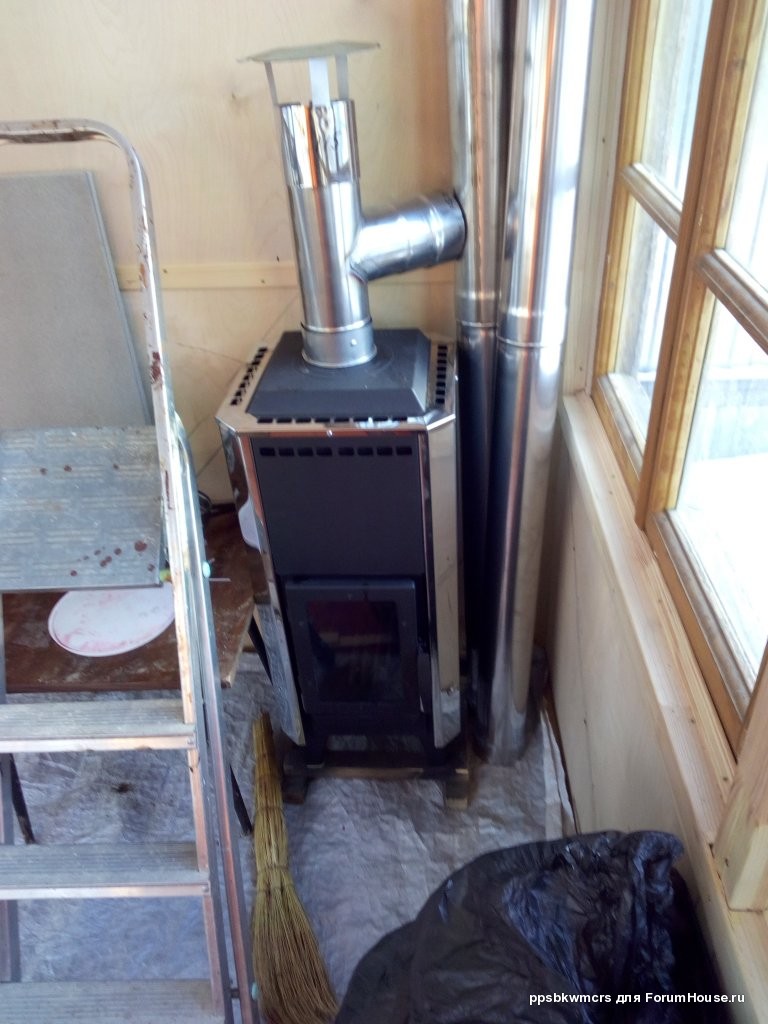 Мы купили печь-камин "Теплодар Вертикаль Металлика". Так же сразу же купили все что необходимо для отвода дыма. Там 4 трубы миллеметровки, 2 держателя труб к стене и наружняя часть с грибом от дождя (там еще саморезом прикрыто для слива конденсата).