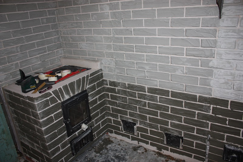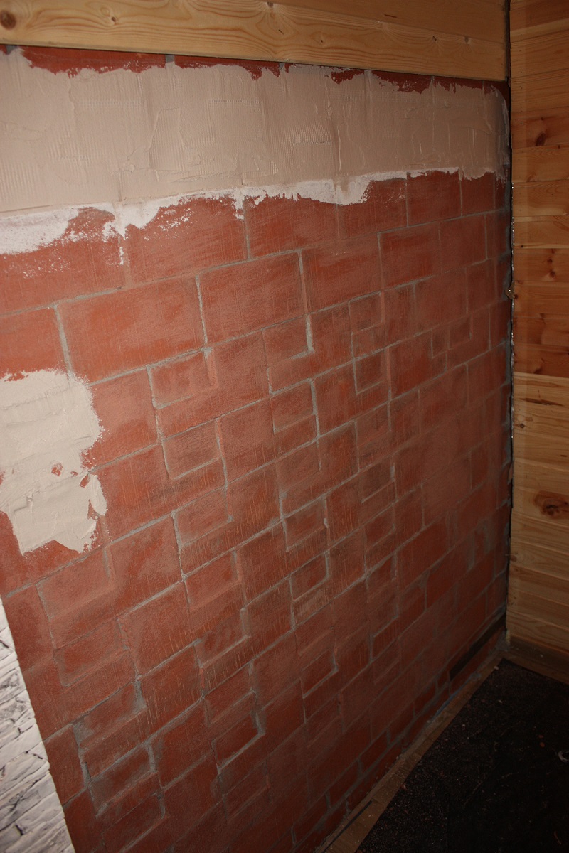 3. Плиточный термостойкий клей для печей Терракот+Термостойкая штукатурка плитонит. Третий вариант оказался самый говняный. Думал в напряжённых местах будет самый надёжный...стенки печи(кое где)когда давал перетоп были около 120 градусов--полёт нормальный всё держит...а вот по периметру примыкания дверки стал осыпаться 2-3 мм. (потом плиткой клинкерной буду выводить другой рисунок)