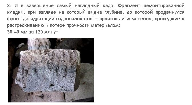 "Низкая теплопроводность обеспечивает защиту заглубленных слоев от воздействия жара огня. Поэтому, когда наружная поверхность газобетона после полутора часов непрерывного пожара терят гидратационную влагу и гидросиликаты кальция деградируют до безводных силикатов, внутренние слои остаются в исходной целостности."