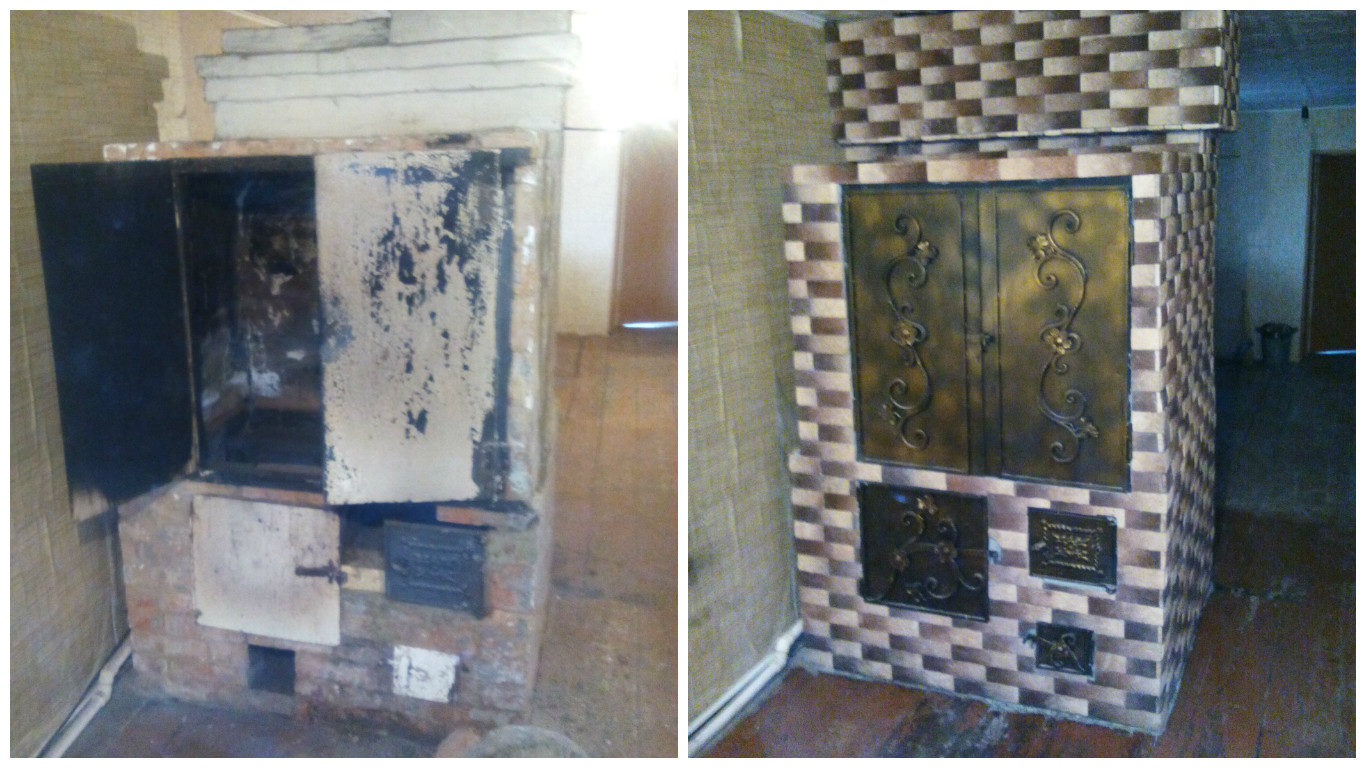 где труба там пришлось выравнивать листами забыл как называеться они используються для зашиты стен в районе баных печей и на них плитка отлично легла . штукатурили тонким слоем чтоб не отвалился при нагреве и расширение на фото может плоховато видно но там стены корявые штукатуркой слегка только неровности сглаживали . а плитка драный камень свою роль сыграла косяки тоже убрались . дверцы все спец заказ в сварочном цеху делали сейчас много умельцев под ковку делают . с этим проблем нет человек приехал замерил дома изготовил и после монтировал на месте там даже коробки родные остались . одна топочная новая магазиная