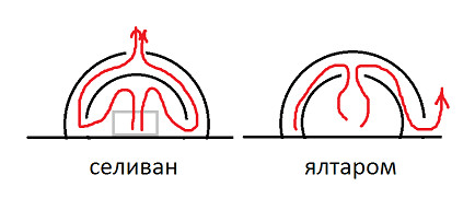...Есть вариант с повышенной высотой перекрытия купола свода. Чтобы пиролизные успевали лучше догореть. Но это тогда не печь, а "яранга" получится продукты будут либо гореть, либо сохнуть.
