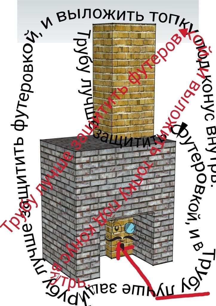 Трубу, которая видна в топке на Вашем эскизе, лучше защитить от перегрева. Топку можно выложить под конус внутрь, если не получится просто квадрат, это не принципиально, излучения в помещение всё равно хватит. Камин согревает пока горит.