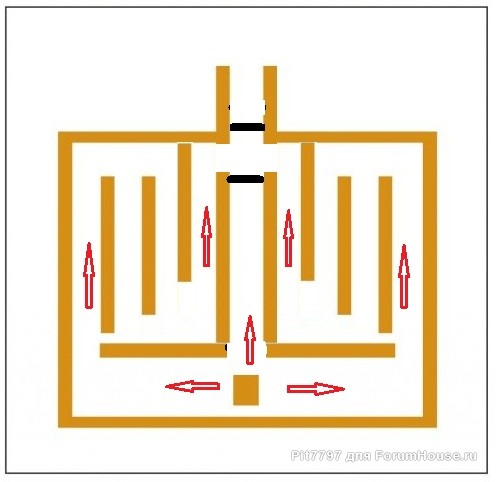 Топка там с духовкой - значит что? - значит имеем колпак. Результат - перегрев капитальный "плиты" и недогрев капитальный щита. Ну и, по моему скромному мнению, поток газов плотным д.б., должен "тереться" о стены печи, а не пролетать со свистом в трубу. Всего вторая печь такая мне попадается с такими каналами и обе говно редкостное, в смыле отопления. Прошу прощения за мой французский