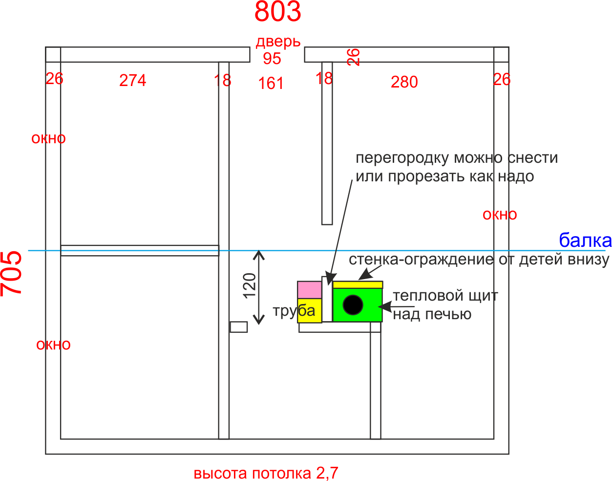 Дымоход из буржуйки можно направить вбок или вверх. Нужно два режима: летний и зимний. Труба может быть частью всего щита. Можно снести перегородку, тольько не понятно, как обходить фундамент. Может, на разных фундаментах класть, может, только под трубу, а щит сделать не очень тяжелым. Модет, сверху стяжки бахнуть см. 20 высотой по обе стороны стены и кольцом притянуть щит к трубе, стена внутри. Я себе представляю его как пустой кирпичный ящик на металлической раме.