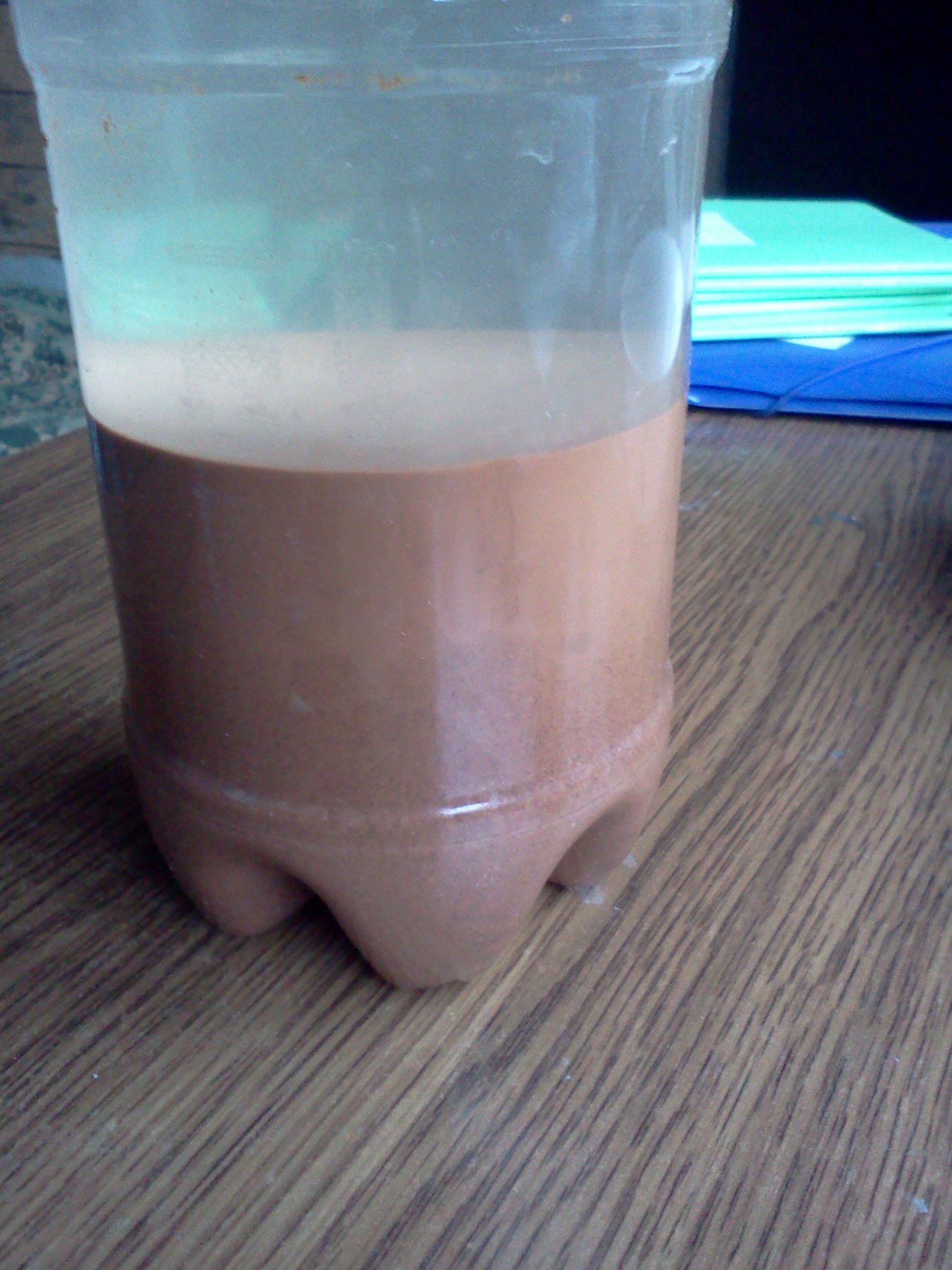 Фото бутылки с отстоявшейся глиной плохого качества получилось, если посмотреть поближе, то глиняного молочка (похожего на какао) примерно третья часть бутылки, остальное - зернистая фракция. То есть, наверное пропорция уже 1:3?