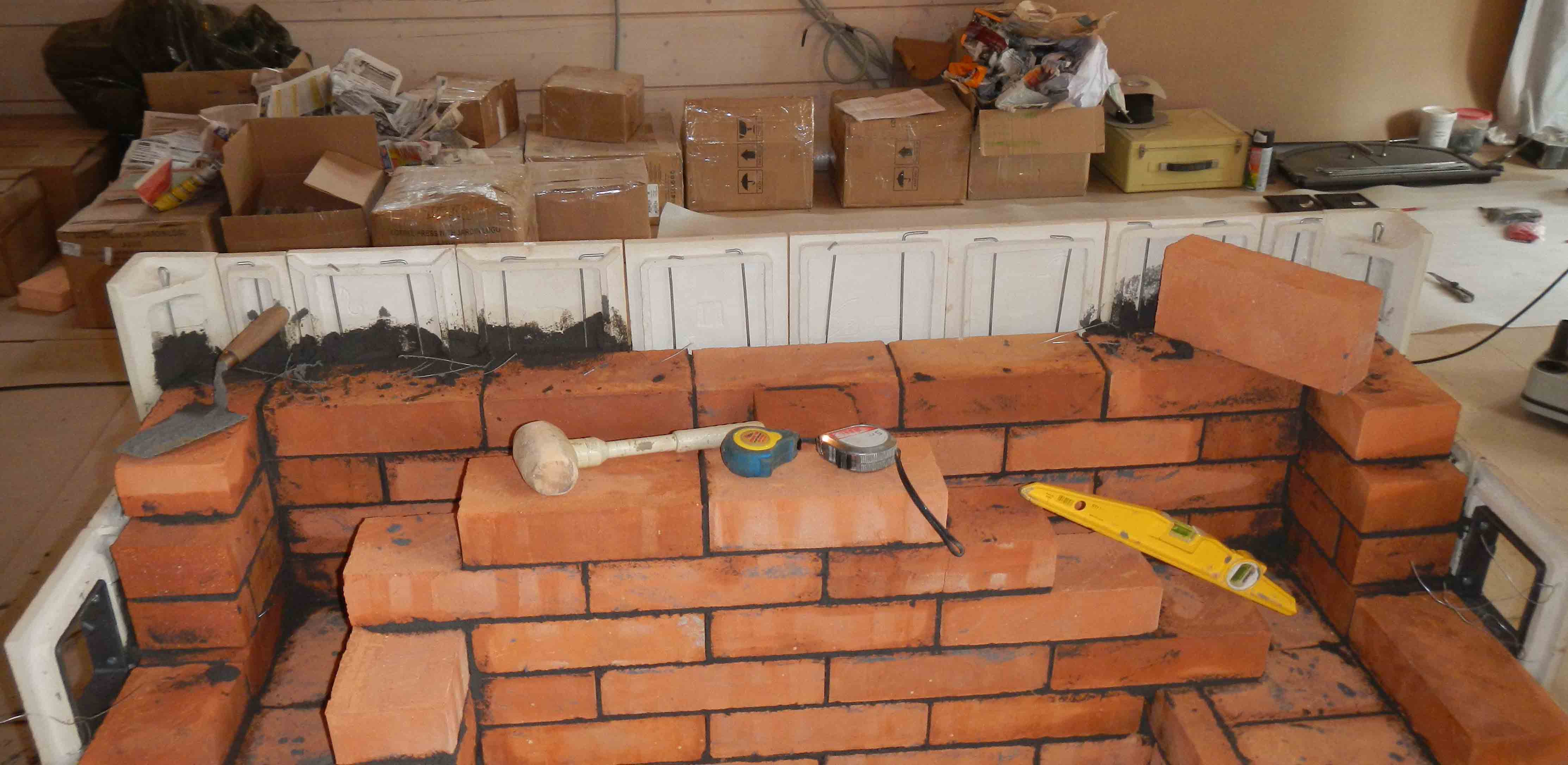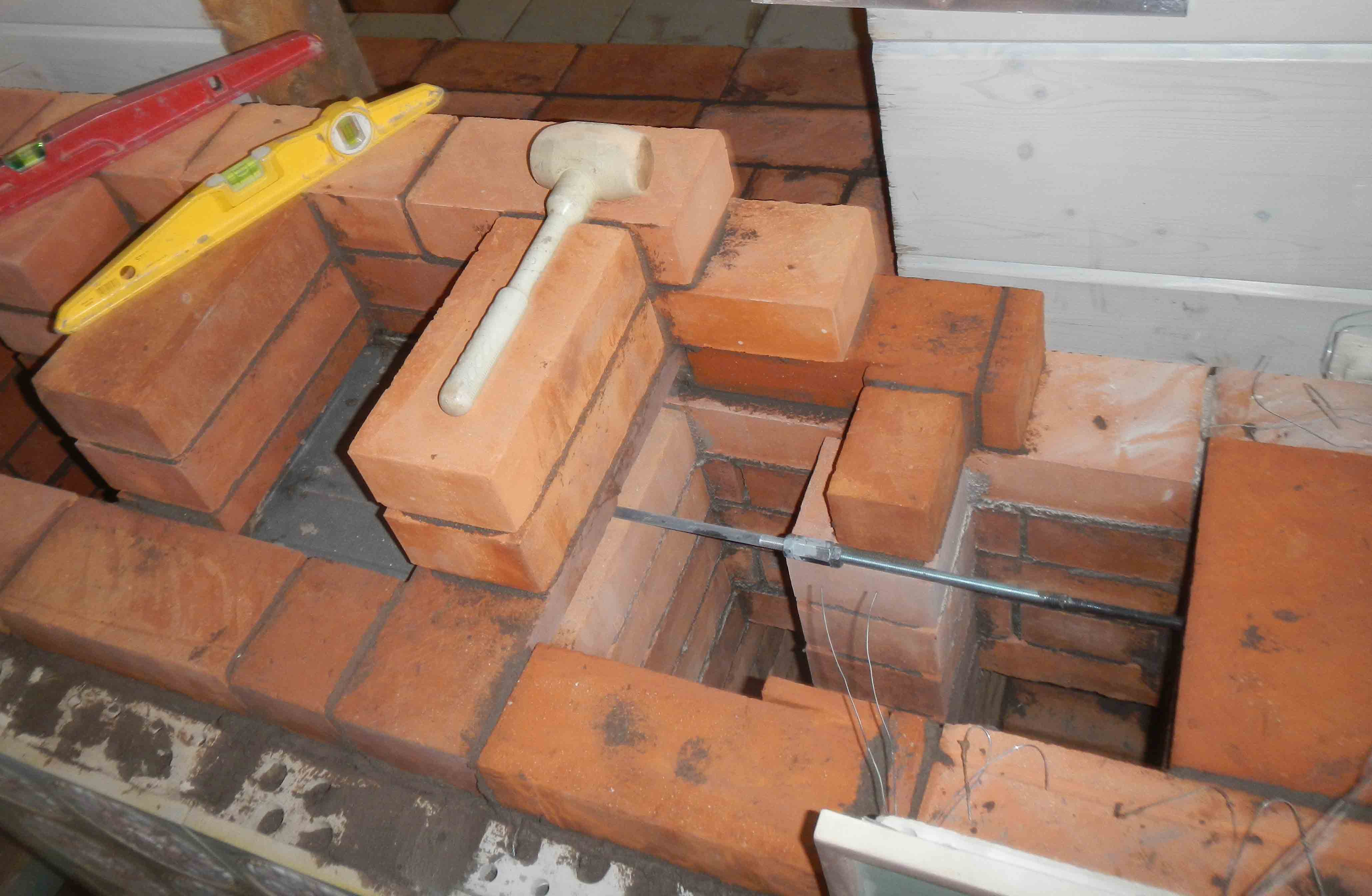 Строительство печи велось параллельно с монтажем изразцовой облицовки. Для крепления изразцов в кладку использовали поводки из нержавеющей проволоки толщиной 0.8мм и костыли для которых чудесным образом подошли тяги для потолочных подвесов. Румпа изразцов заполнялась глинопесчаным раствором.