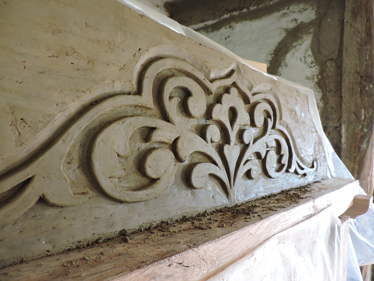 Когда опалубку сняли были вырезаны печурки и изразцы по сырому глинобиту. Глина в этот момент податливая и легко режется. Можно резать любую красоту