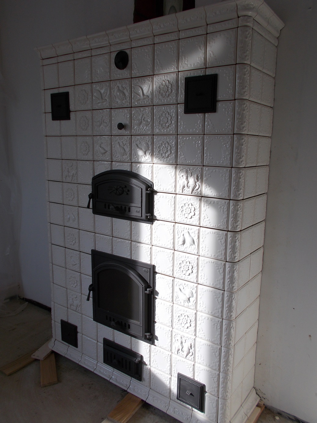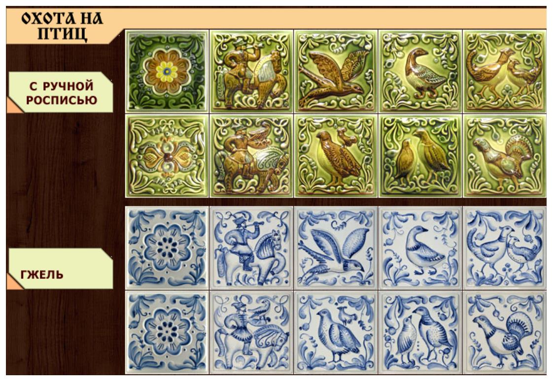 По изразцам: Изразцы выполнены литьевым способом, они тонкостенные, так называемые "фарфоровые", имеют неплохую геометрию. Хорошо режутся на станке с водяным охлаждением и сплошным диском без сегментов. Мы использовали изразцы различных цветов и покрытий, первая печь с изразцами белого цвета, глянцевыми, а вторая с изразцами цвета слоновой кости матовыми. Данные изразцы имеют размеры 15-15см, и самую дешевую цену на отечественном рынке. Мы использовали изразцы коллекции "Охота".В коллекциях изразцов представлено всего шесть элементов, поэтому приходилось выдумывать карнизы, плинтусы, бордюры и различные переходы из того что было. Фасадные изразцы имеют семь различных фигур охотников и дичи, глухари, тетерева, утки, соколы и рельефный изразец.