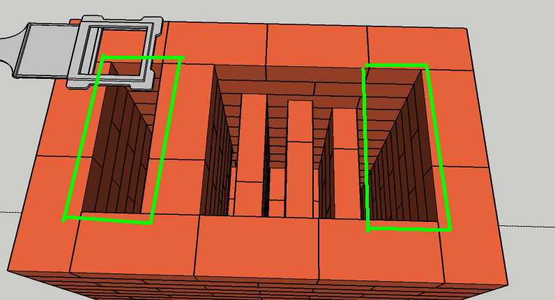 5. раз нижний угол не прогреть при таких дровах, может изменить верхнюю конвективную систему, чтоб верх равномерней прогревался. Посмотрел форумы на трех сайтах (строители, печники, форумхаус) нашел там варианты "верха". Собственно вопрос КАКОЙ ЛУЧШЕ? Колпак не хочу. Выкладываю все чего смоделировал.