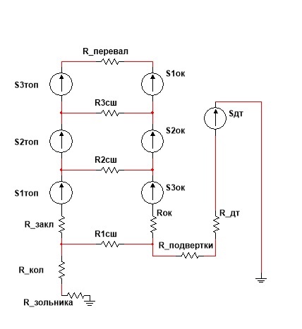 Поток встречает сопротивление зольника и колосника. Далее важный момент , поток преодолевает сопротивление закладки дров, которое одно из самых больших во всей цепочке. Начинается зона горения и поток разгоняет самотяга топливника. На рисунке я разбил топливник на три зоны . Зона уровня колосника(S1топ), зона над закладкой (S2топ) и зона свода (S3топ). Далее идет сопротивление перевала или хайла , в зависимости от конструкции. Потом газы идут по опускному каналу , встречая сопротивление самотяги опускного канала S1ок+S2ок+S3ок+Rок . Потом через подверку уходят в дымовую трубу с самтягой Sдт и сопротивлением R_дт.