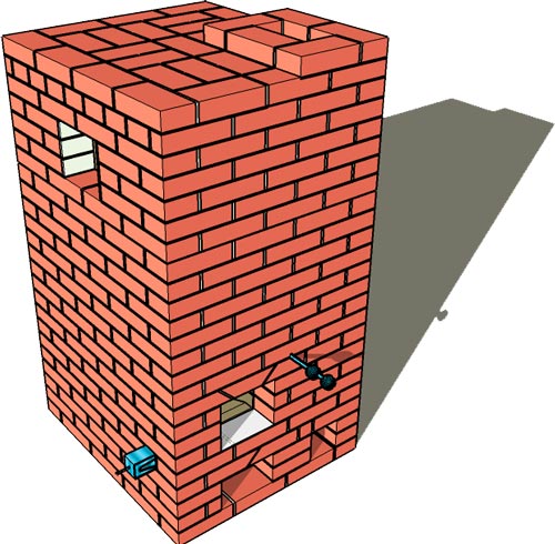 Не смотрите на кладку, кривенько и косенько... Это моя первая печка, построенная сразу после семинара. Главное сам принцип - можно построить хорошую печь в бане даже с низким потолком. Минус - объем каменки сильно ужимается, камней много не положишь. |