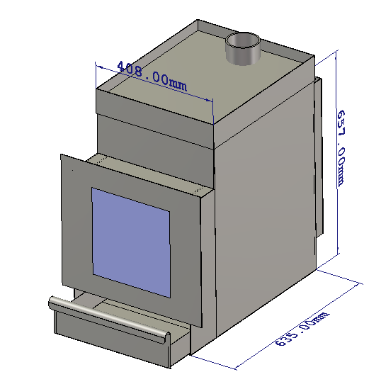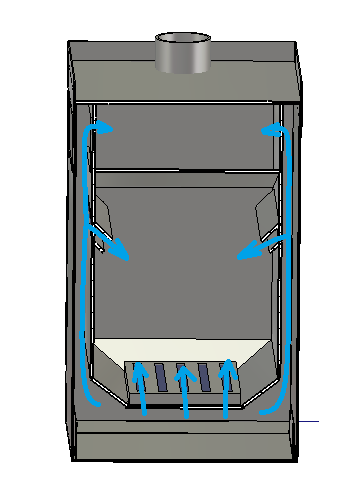 Хочу попробовать сделать комбинацию подачи воздуха снизу через колосник + дутьё сверху. В остальном - классическая железная печка. Вторичный воздух над дефлектором тоже добавил.
