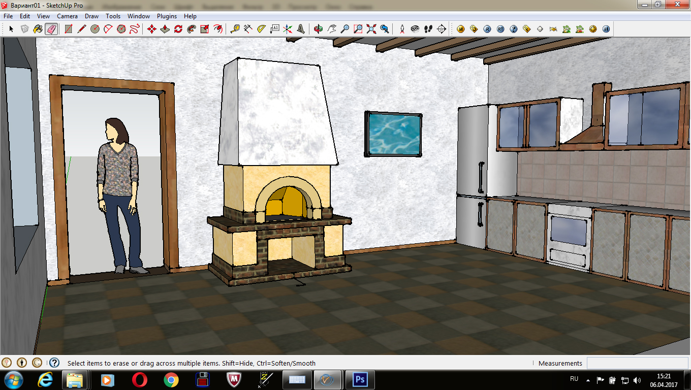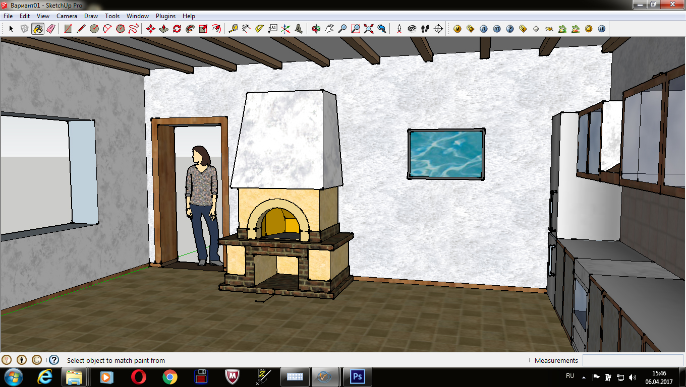 Очаг. В кухне-столовой. Или камин с глубокой топкой. "Очаг" - больше нравится ). Позже будет заказана полукруглая металлическая крышка-заслонка на портал. Аналогичное уже делал, люди щи-борщи-каши в чугунках на углях готовят после длительной протопки. Высота портала позволяет не "ползать раком" перед огнём (как в типовых английских каминах), а сидеть удобно и жарить шашлыки или мясо на решётке. Палить древесину только "для радости глаз"... это как-то не есть гуд. )