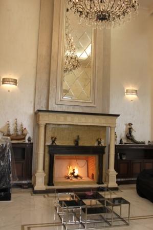 Как не кирпичный. Самый настоящий кирпичный. А снаружи облицовка выполнена мастерами из Италии. Сначала этому олигарху хотели впарить топку чугуниевую. Он наотрез отказался . И топку они уже купили и привезли. Он настоял -найдите мне мне печника чтобы построил камин из кирпича -но не такой как в фильме "жмурки". Его этого клиента тоже зовут Михалыч. И он настоящий персонаж из 90-х -а не художественный вымысел в образе Н.Михалкова. Коммерсы и трубу уже заложили для европейского камина с сечением меньше чем для кирпичного. А каминчик то он захотел приличный -большой. Вот пришлось рисковать,строить и бояться что он как и Михалыч киношный сожгёт меня в камине. Слава богу -прокатило. Камин заработал -на фото первая протопка. Ох как там опричники проверяли тягу досконально. Я даже и не знал таких способов проверки. Ниточек навесили на проём портала -фиксировали в какую сторону ниточки отклоняются. Проверили прибором измеряющим скорость движения воздуха, газоанализатор припёрли -проверить содержание СО в помещении. Экзамен сдал -иначе в топке сожгли бы.