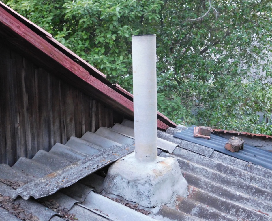 На веранде находится печь в виде 3-канаьного отопительного щитка с варочной плитой, на крыше последняя часть дымохода, 1 метр, выполненная из асбестоцементной трубы с внутренним