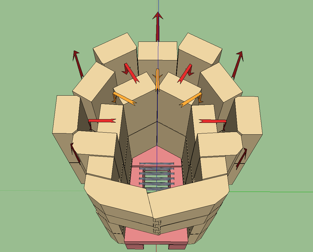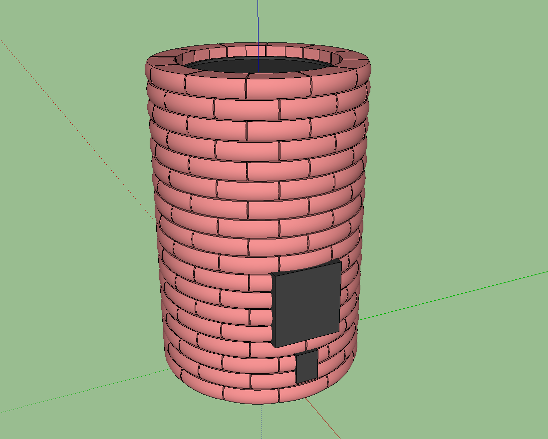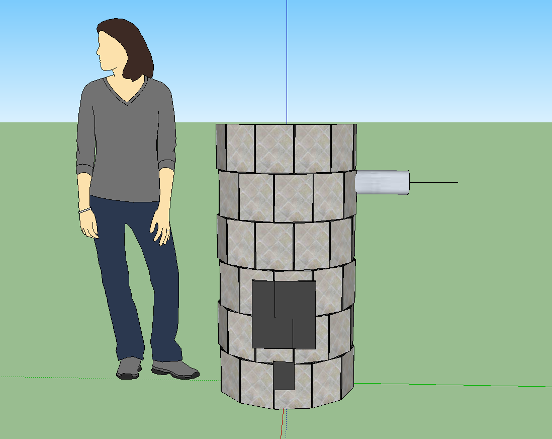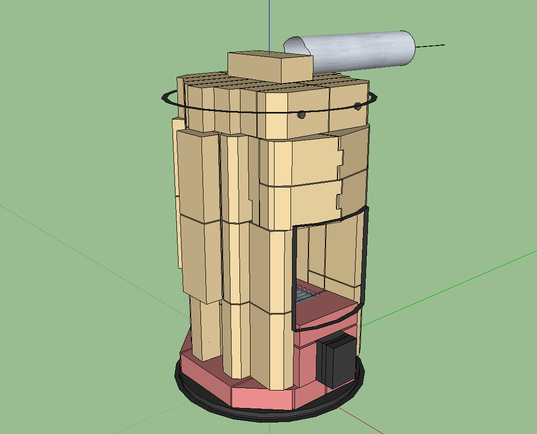 Дачный домик, старый не утеплённый, из бетонных панелей. Надо отопление в весенне/осенний период. Ранее пытался нарисовать печку, но получалось очень сложная, много резки и ненадёжная, так как не печник и опыта нет. Теперь решил сделать как можно проще, как можно меньше резки кирпича. Круглая в футляре, надёжная простая печь, кирпичи на ребро (на тычок, шамот), вместо футляра бочка 200 литровая. Мелкие опускные каналы, а затем, тоже мелкие подъёмные. Внизу коллектор для выравнивания, между опускными и подъёмными щели ~ 5 мм. Сверху на топке перекрышка, два ряда кирпичей на шпильках.