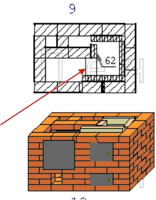 2. В девятом ряду, ниже метки 62, нарисован не заштрихованный кирпич. Это кирпич предыдущего ряда, или это изображено что он перекрывает футеровку и стенку колпак или что-то другое?