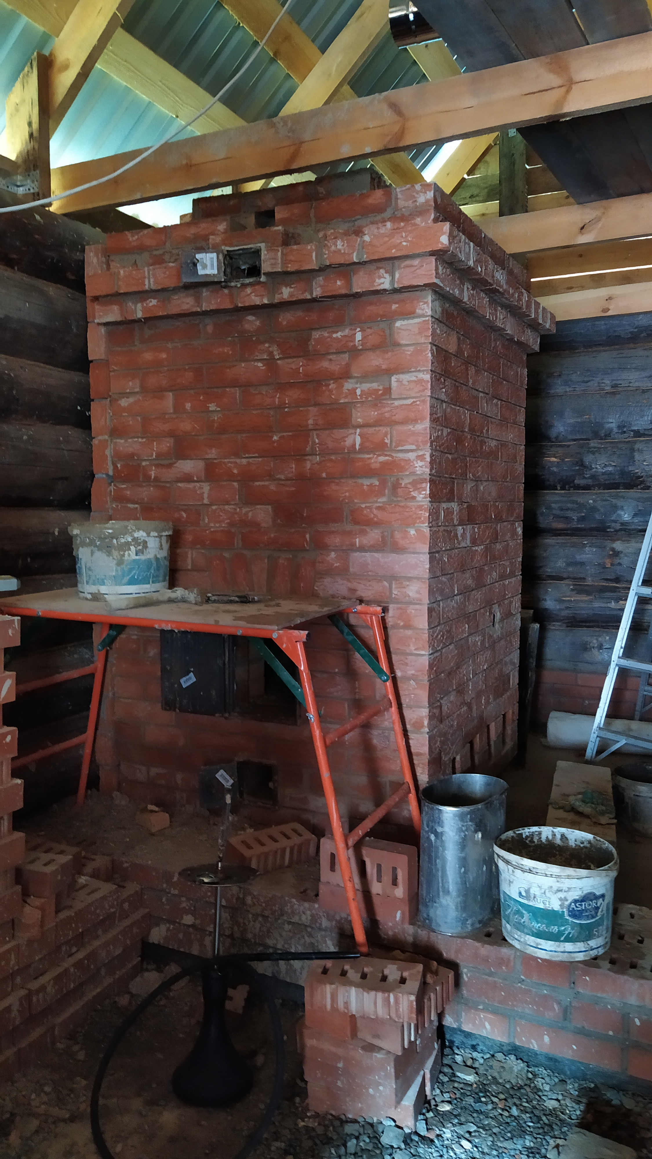 Пересмотрели стратегию возвели сруб ,сложили по книжке печь прямоточку простейшей конструкции ..закрался вопрос о баке..прямоугольной формы который должен греться от исходящих газов перед трубой..оборачивать его полность в картон или только верхнею(не соприкасающуюся с газами)часть
