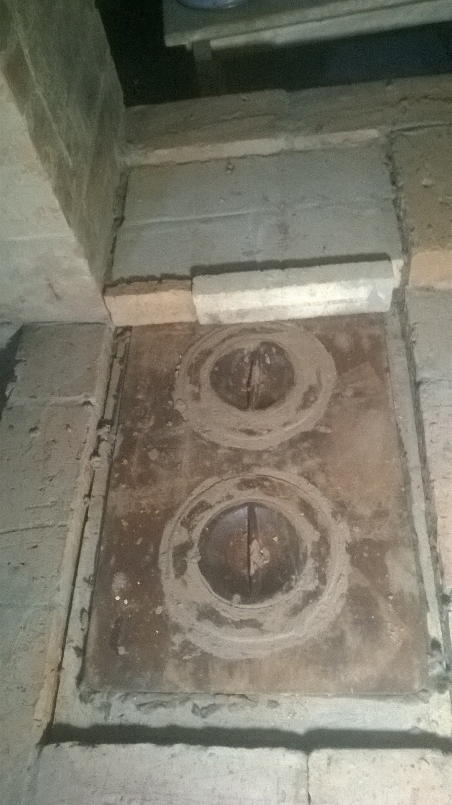3. Сзади - 1 трещина 1,5 / 0,7 в вертикальном шве примыкания печки к щитку, на 5-6 рядов кирпича от верха. Да, печь перевязана со щитком только в районе дымового канала, на 4 ряда, верх не перевязан.