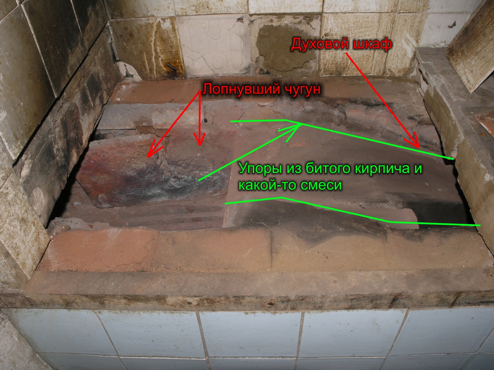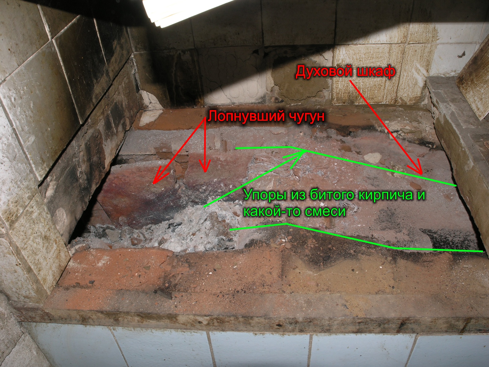 Топка и облицовка в ужасном состоянии (на фото при первой разборке, боюсь пока что-то трогать, особенно то, что отмечено зелеными контурами).
