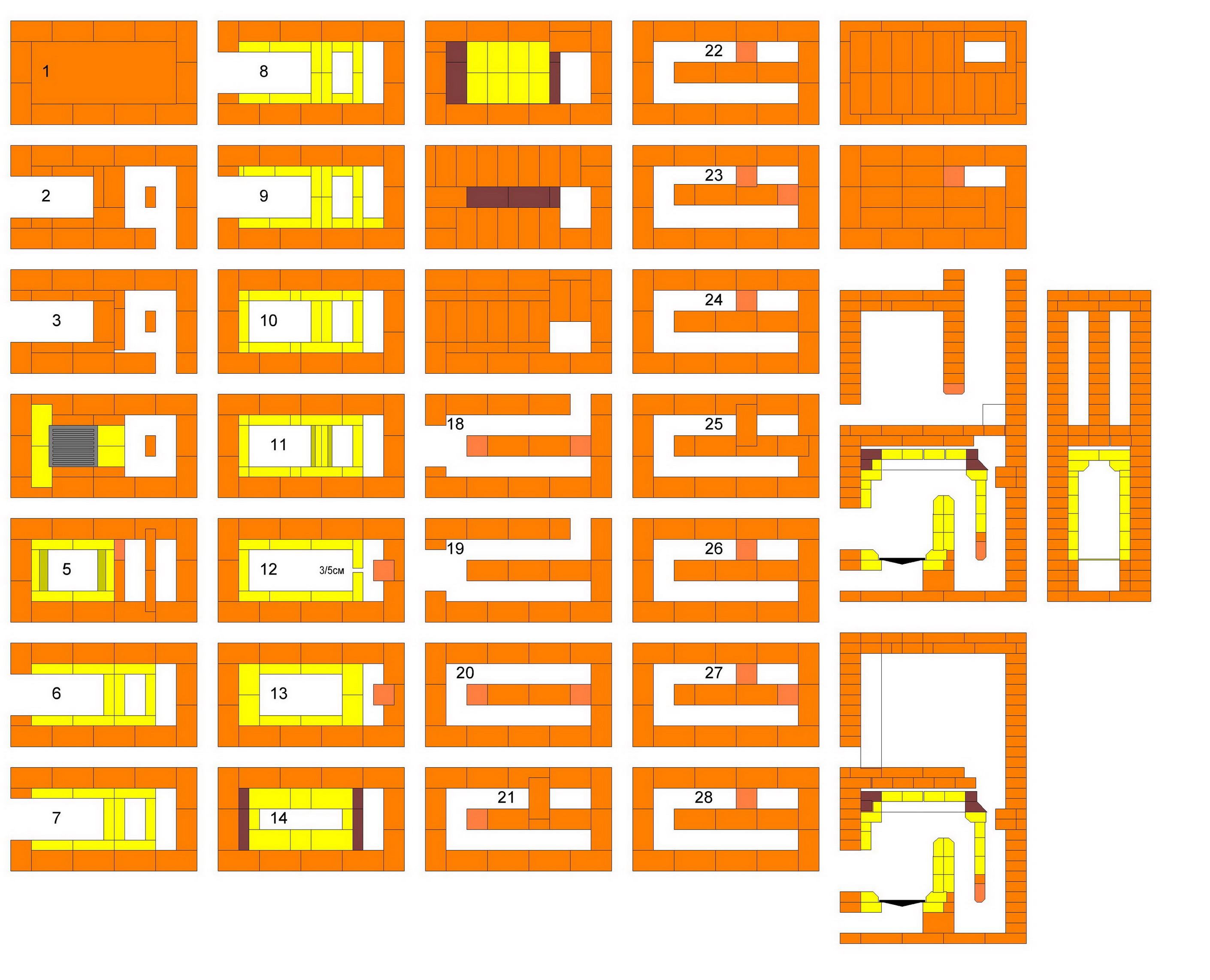 Добрый день. Два года назад благодаря форуму и лично internet_pechnik поставил на даче печь, которая благополучно работает. Дошло время и до второй печи. Размер 2,5 на 4 или 2,5 на 4,5 топка с короткой стороны труба в углу слева. Перечитав форумы и посмотрев множество порядовок, решил набросать сам печь. Выкладываю на ваше обсуждение и корректировку. Трудность в перекрытиях топки и верха печи не уверен что сделал правильно, подскажите пожалуйста. И много пилить шамота придется, возможно есть способ сделать проще. Шамот только ША-8 в наличии. Спасибо заранее.
