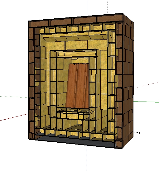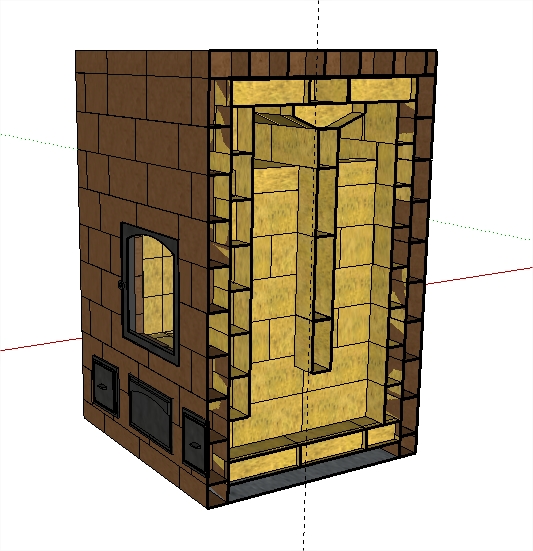С огнеупором перебор - он не нужен там, где нет пламени,да и перекрывать всё это будет не легче, чем печь со стенками в полкирпича. Идея полной футеровки всех каналов и наружная кладка на ребро не совсем мне понятна; по-моему мнению проблем будет не мало и с конструктивом и с теплопередачей(она разная в разных направлениях теплового потока в кирпиче).Топка по моему великовата для таких тепловоспринимающих поверхностей(ну тут надо считать точнее), и что это за склад стройматериалов в топке? или это элементы какие-то специальные.