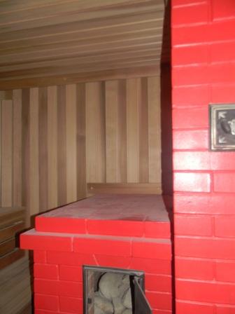 Зимний вариант 2014 гибрид металлической печи с щитком- задача приблизится к режимам русской паровой бани . Переделка печь НАРНИЯ кирпич витебский много брака пришлось красить печь - портал также разбирается и можно при желание поменять на подобную по высоте конвекция идет с 3 ряда . Щиток одноколпаковый с задвижкой летнего хода на холодную трубу 130 см подымливает видно на портале в виде туннеля по фото на белой стене . Сама баня деревенская потолок 210 см брус 150 мм состоит из предбаника и парилка 2м на 3 м она же помывочная жутко не удобно сделал перегородку разделил зоны . Нагрев воды идет насадным теплообмеником типа самовар грет 80 литров воды за 2.5 часа . Отделка самим хозяином .Сам топил и парился жесткого излучения почти нет три часа на градуснике 70-80 можно и больше но зачем !! +щели в брусе . На следующей день 40 щиток и массив еще горячий.