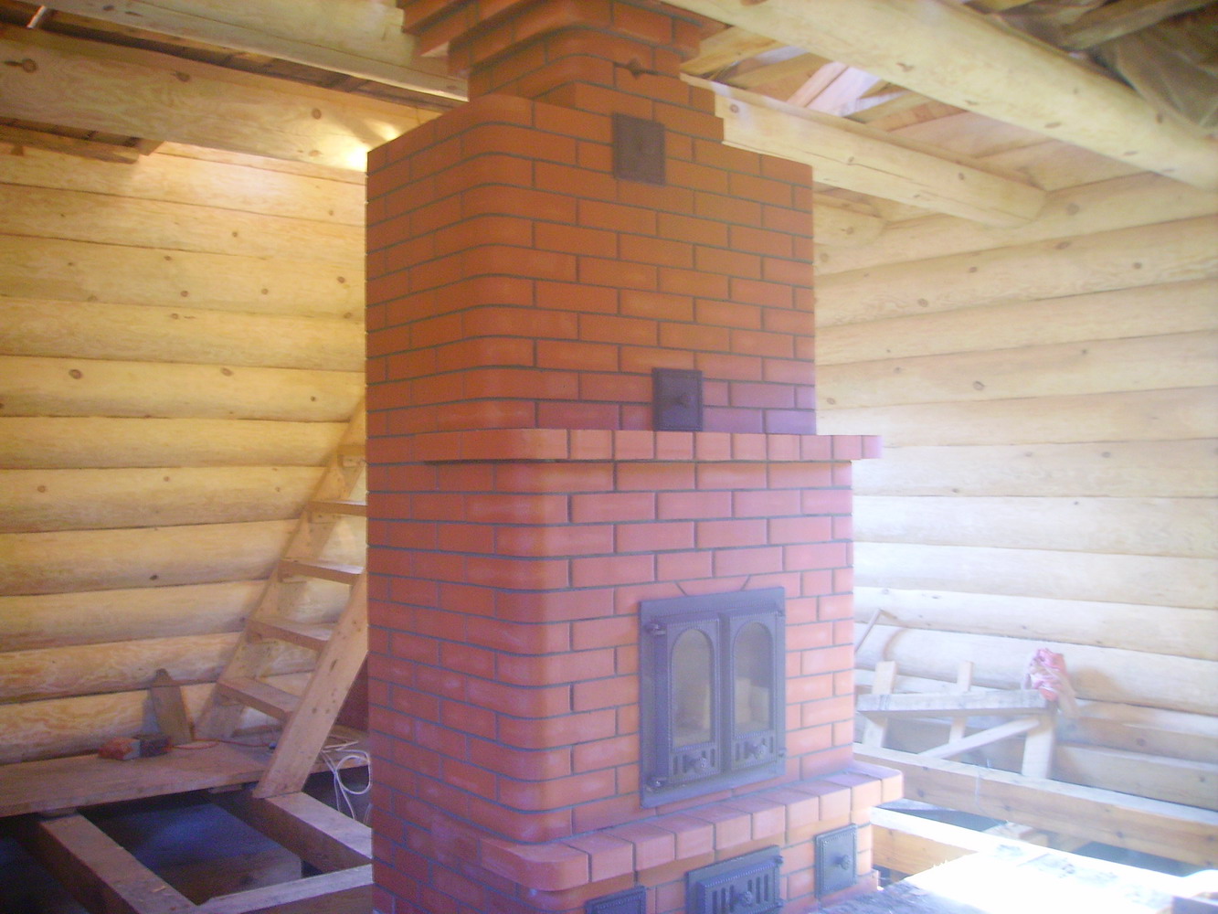 а это еще зачем? видеть макушку печи из пола? типа подогреть трохи и мансарду? К тому же у вас посреди дома явно капитальная стена с балками. как там прикажете ее кромсать до самого пола мансарды? Как правило -там всего лишь вырез в стене делается , проем, как под дверь на высоту чуть более 2м. А выше -обязательно целые сплошные венцы, это ж- жесткость дома.