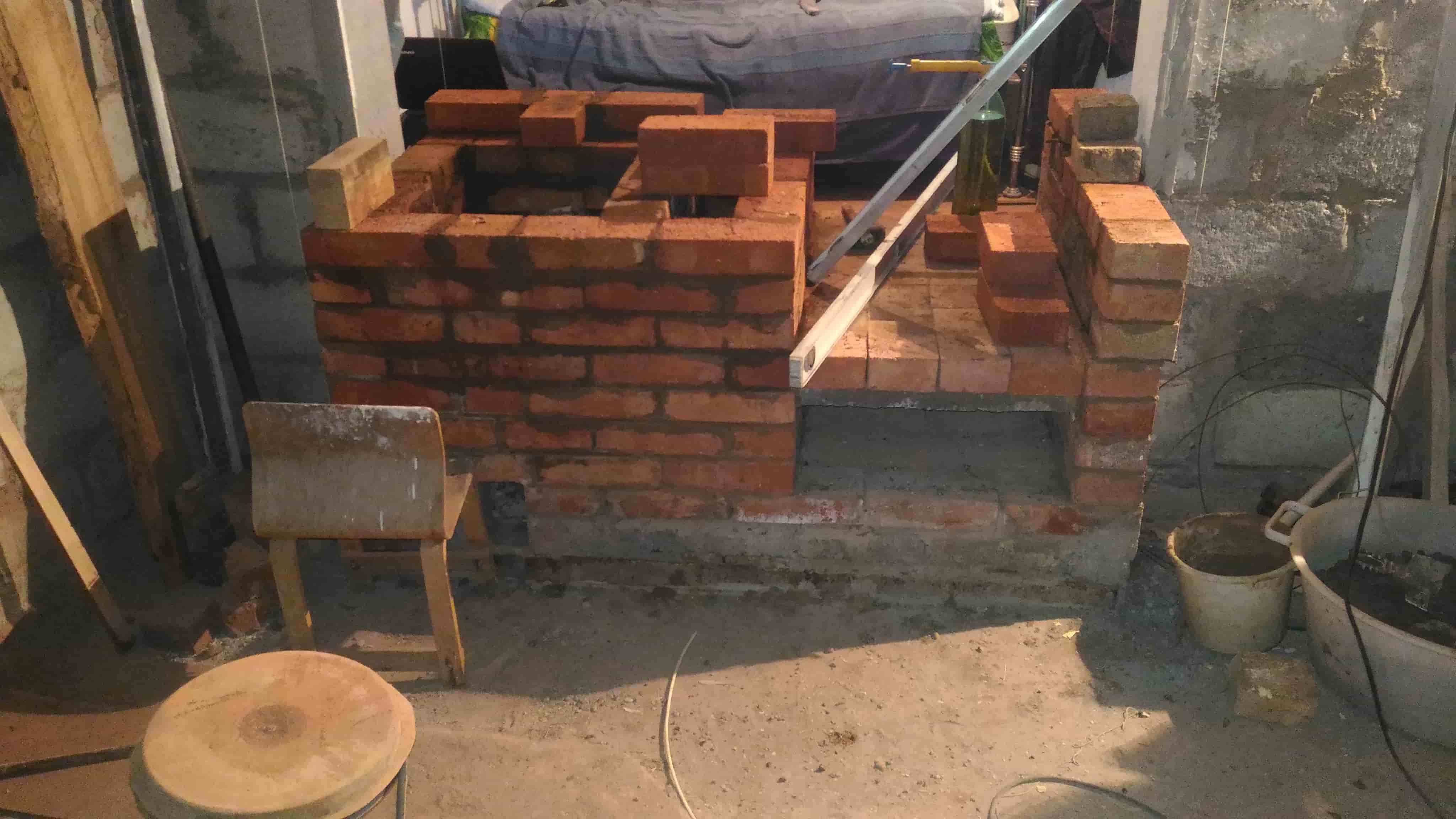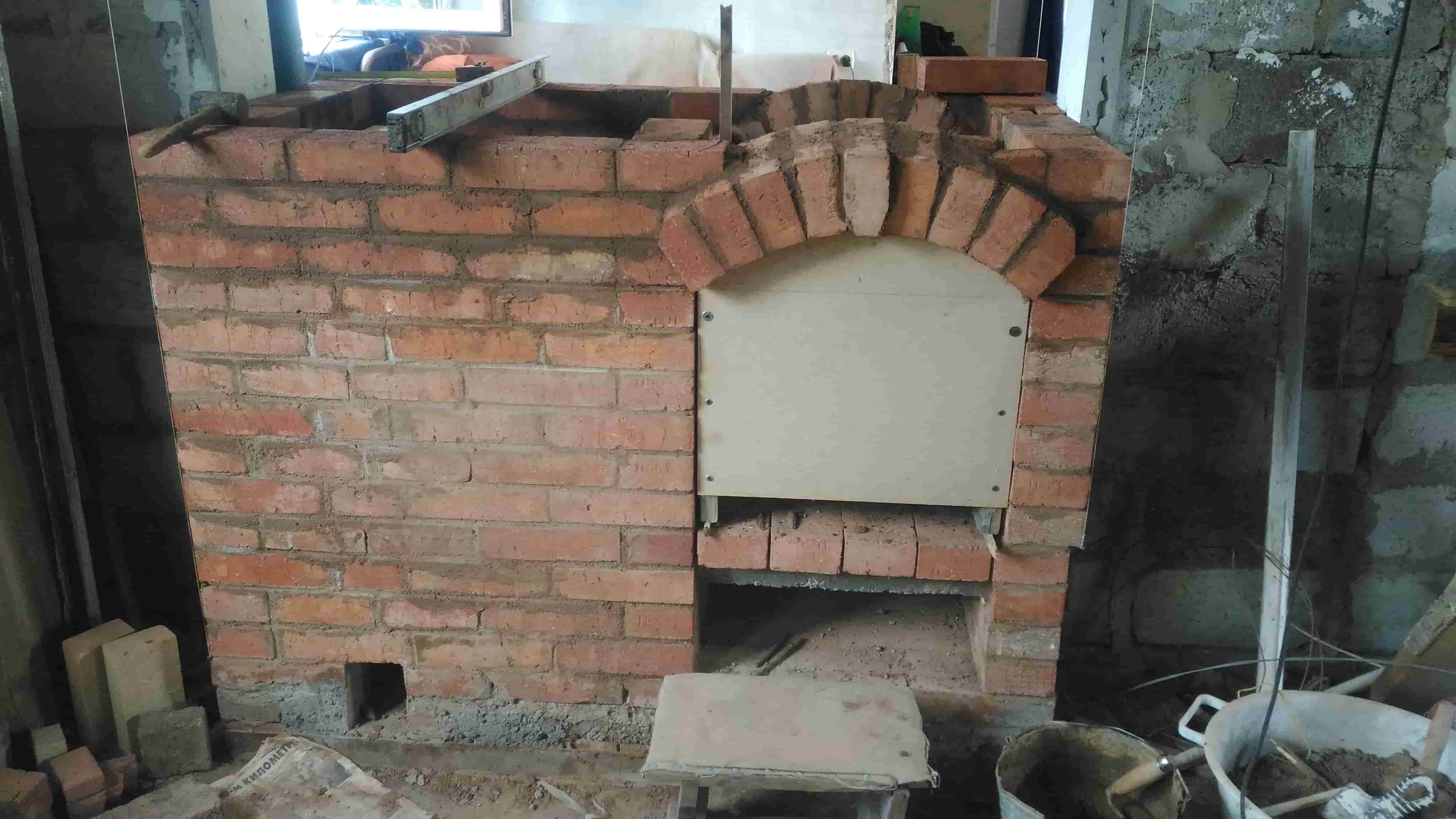 На фотографиях видно, что одно крыло будет опираться на кладку толщиной в 0.5 кирпича, нда... маловато. Посчитав нагрузку на арки портала камина и прикинув величину распорного усилия продолжаем работу дальше безо всяких усилений.