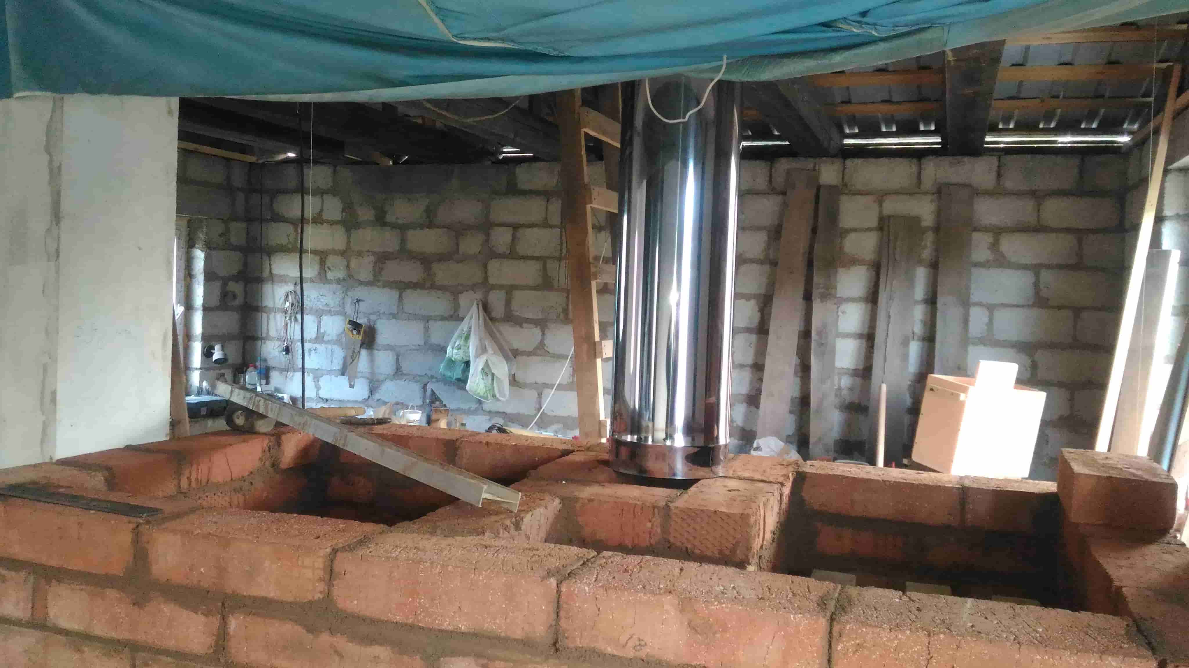 Ещё проблема, крыша почти плоская, просилась высота трубы 3700 мм (две нержавейки L=1000 D=200) вместо положенных 5000 мм. Решил делать по своему, в крайнем случае после испытаний наращу сколько надо.