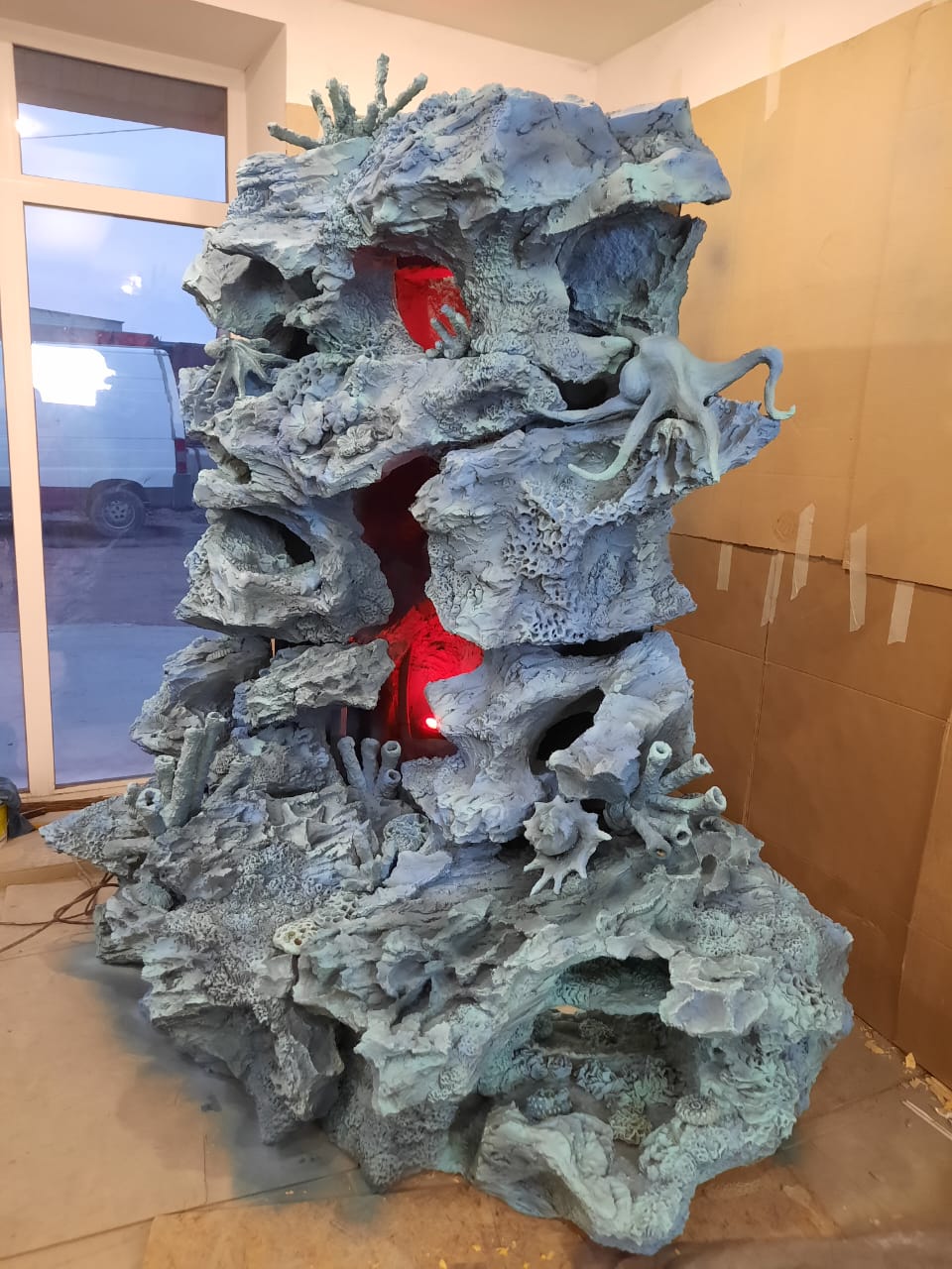 Водопад меняет цвета воды,разноцветной подсветкой.