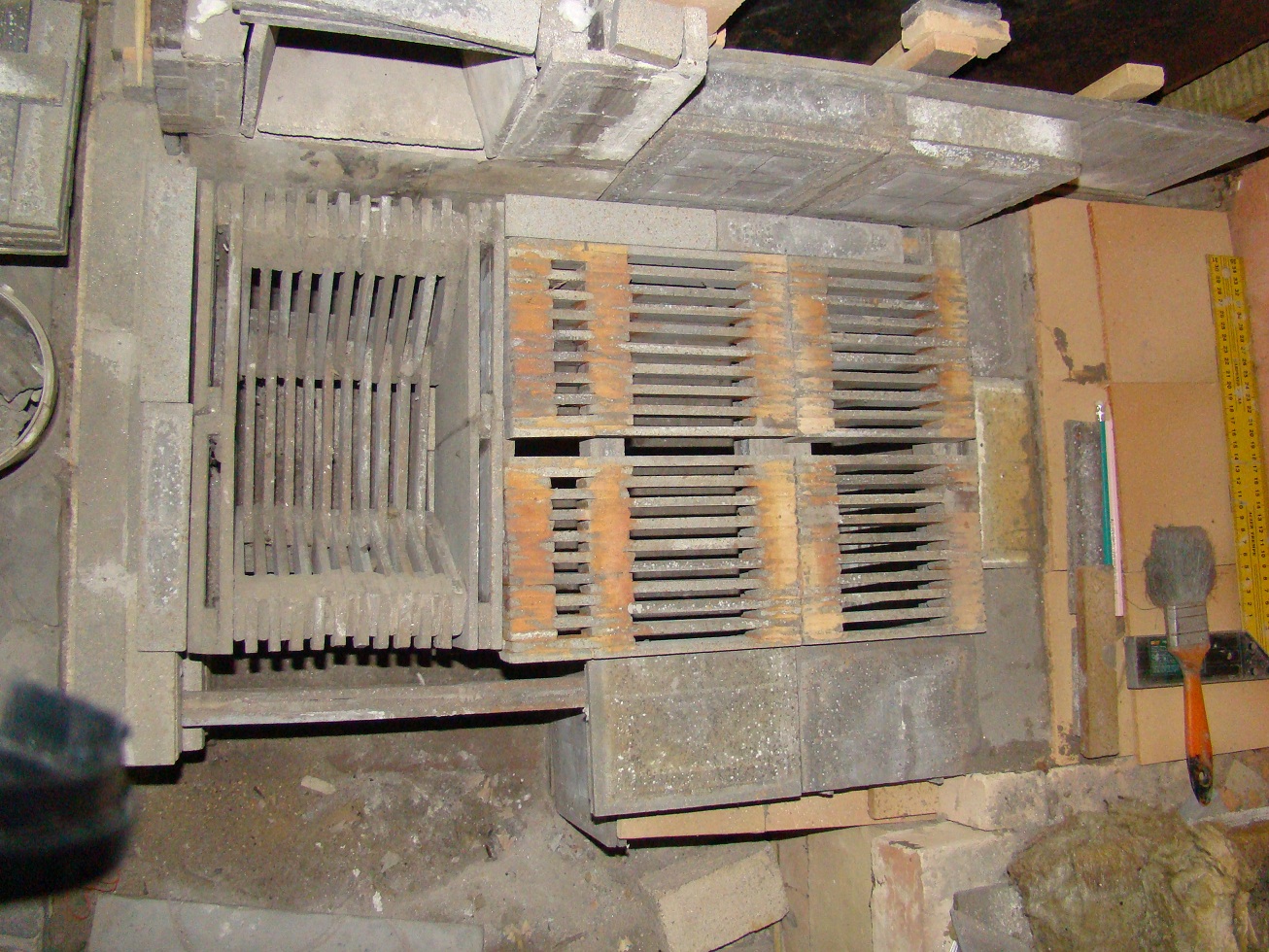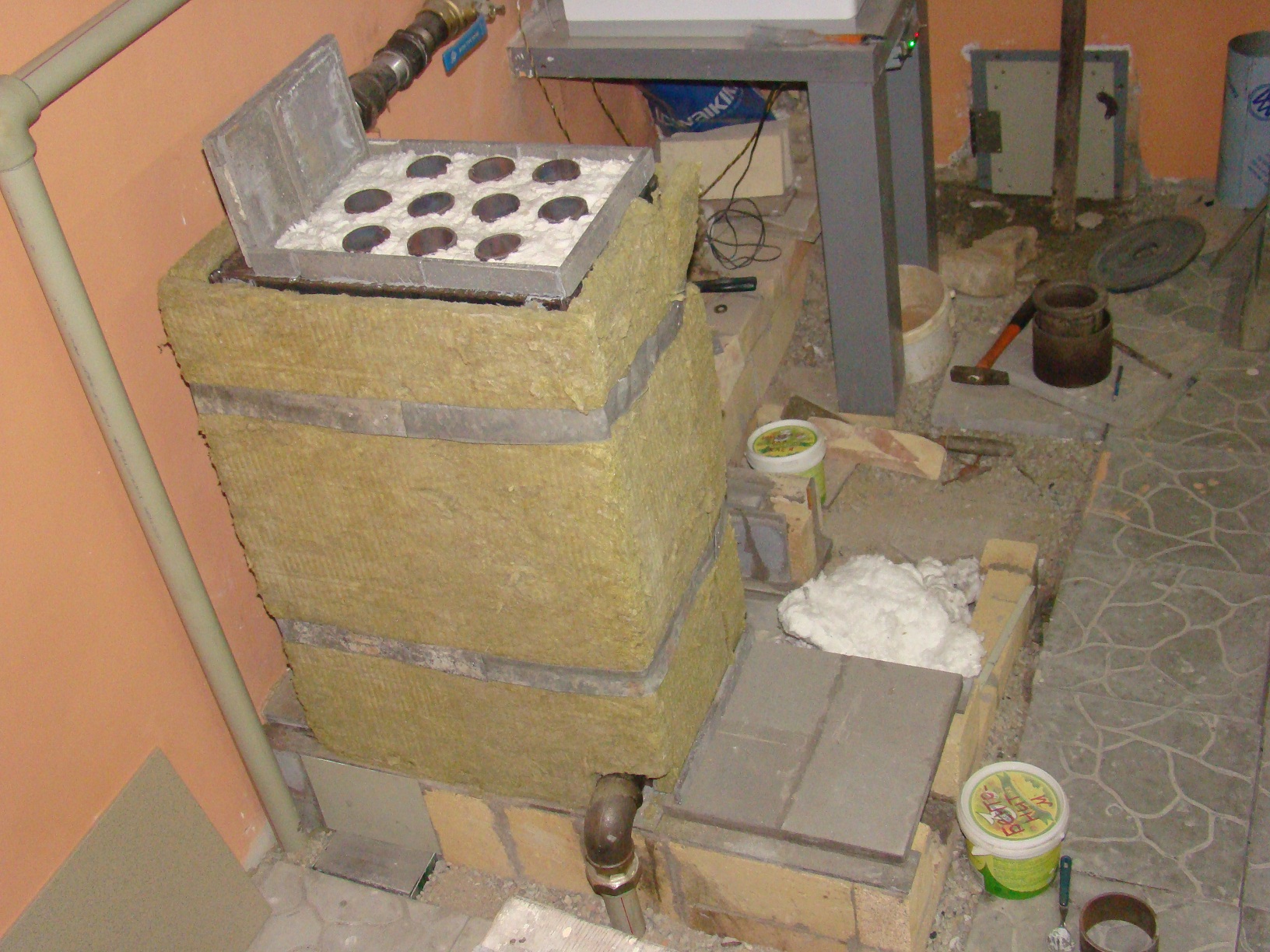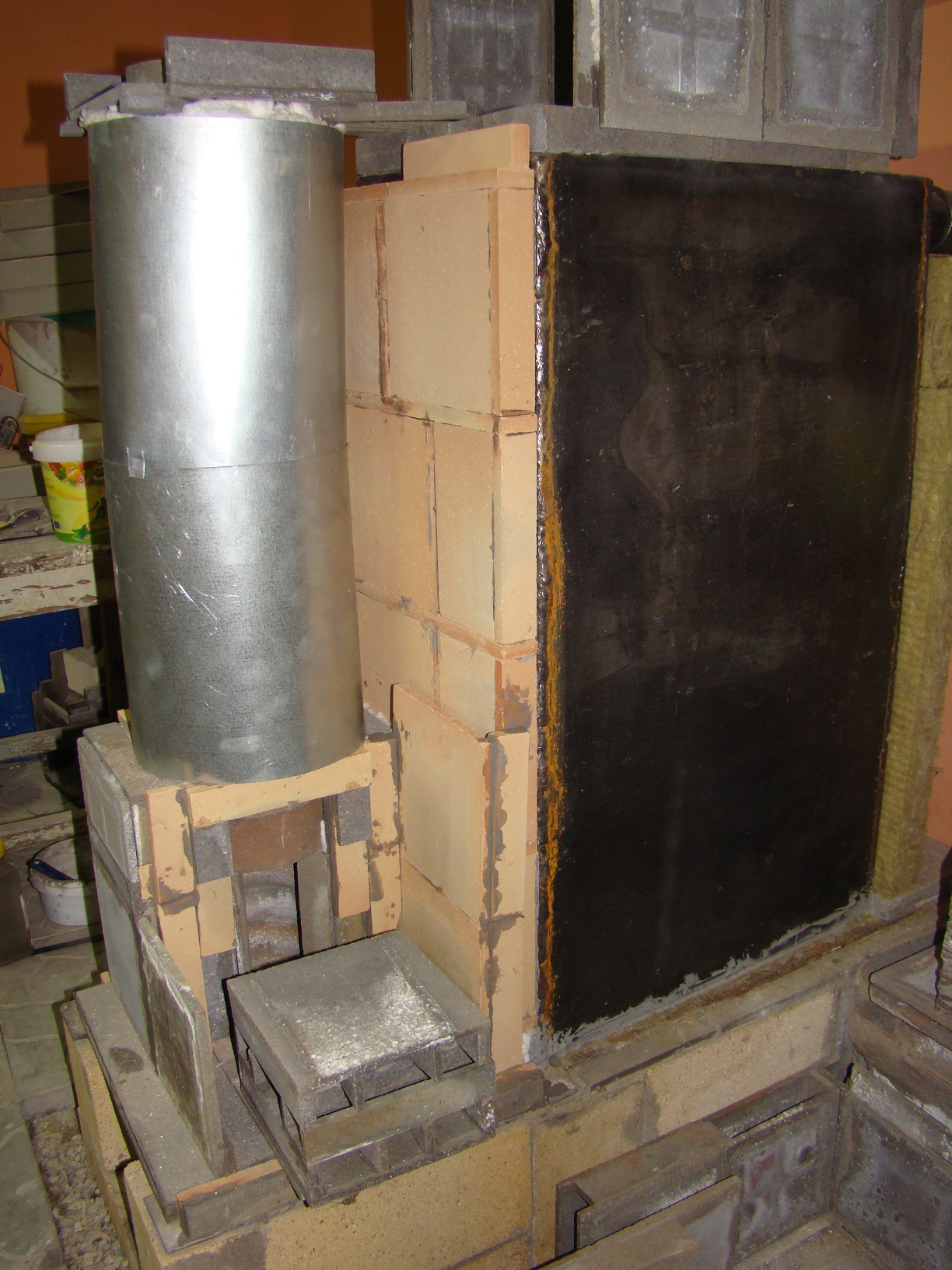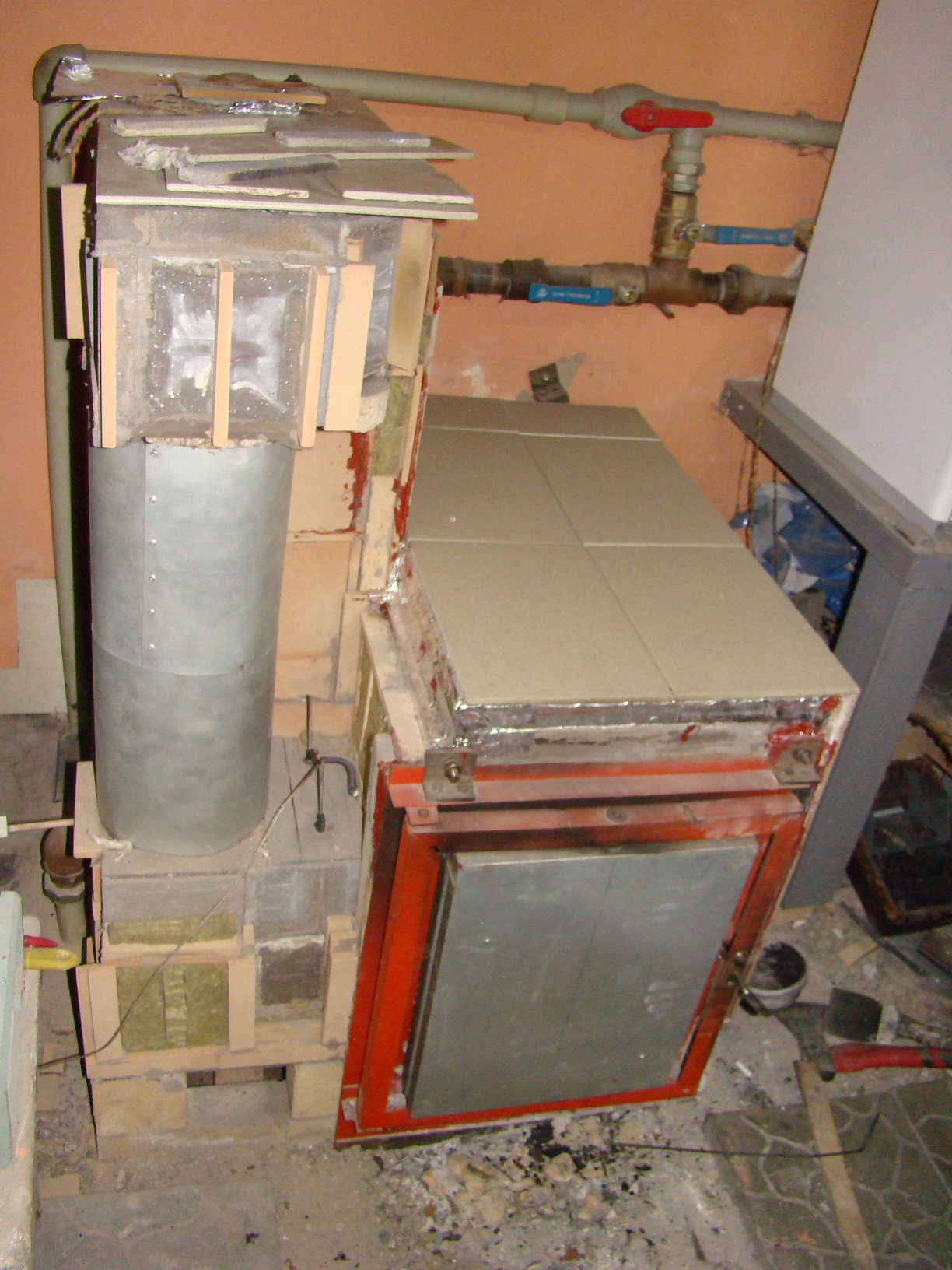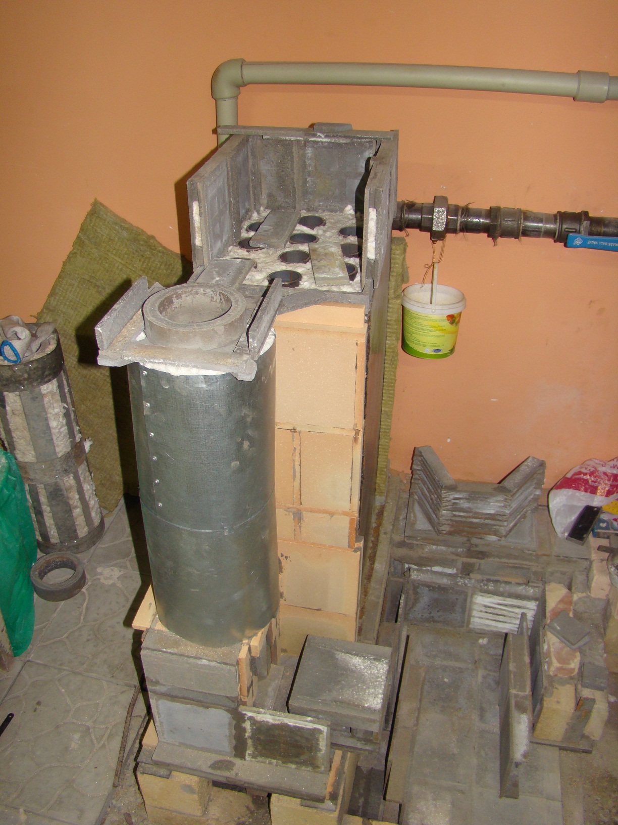 В силу того, что много прямых, квалифицированных рук отправилось на ПМЖ в сторону, противоположную сданного в металлолом станочного заводского парка, некоторые вещи пришлось упрощать, а попутно перекраивать конструкцию с целью повышения ее живучести. Таким образом пришлось делать теплообменник не с нержавейки, а из простой чернушки неизвестной марки, да еще в самом простом жаротрубном варианте. Вот с него все и началось. Фундамент сделан из обычного красного кирпича, который уложен в котлован, вырезанный в весьма плотном суглинке, поверх кирпича уложена огнеупорная керамическая плитка, на которую в качестве опорного элемента установлен шамотный кирпич в количестве 10 юнитов. На кирпич установлен 45 уголок на котором ТО и упокоется. Внутренняя полость соединяется с газо (дымо) ходом, соединяющим выхлоп котла с основной дым трубой. Дабы дальше не описывать материалы, сразу скажу, что из металла только дверца котла и подвеска свода, все остальное выполнено из керамики. Ну еще в теплоизоляции фольга алюминиевая присутствует....