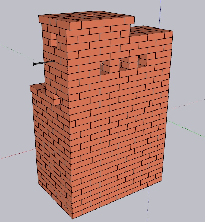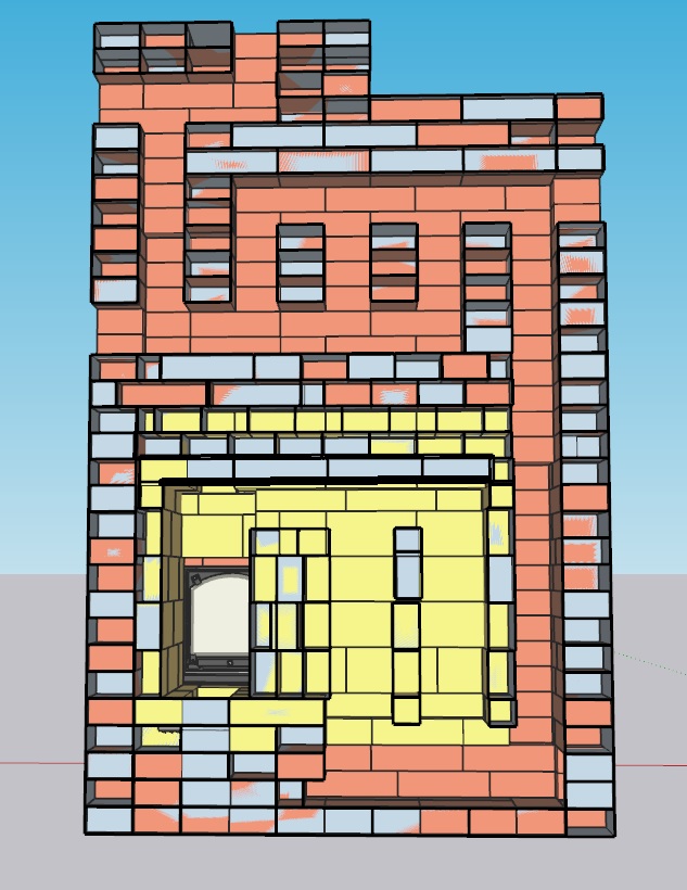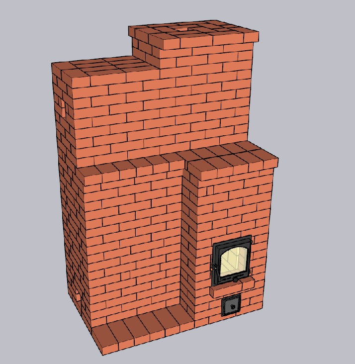 Со SketchUp так и не сложидась дружба.Потому кирпич и фурнитура взяты из скачанного в инете проекта.В размер кирпича изначально заложен шов 5мм. tuomob ,Ваши слова я услышал.Угол проекта до верха шамотного ядра,с четкими размерами кирпича и швами,был поднят в Инвенторе.Здесь же,просто уложил "кирпичики",даже не снимая фаску там где она должна быть.Это всего лишь 3D модель,на реальной кладке все будет,скажем так,чуточку иначе.