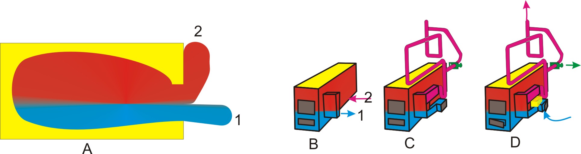 Схема саморегуляции суммы притекающих 1 и исходящих 2 газов за счет протискивания встречно в одно отверстие. Как в Русской печи.
