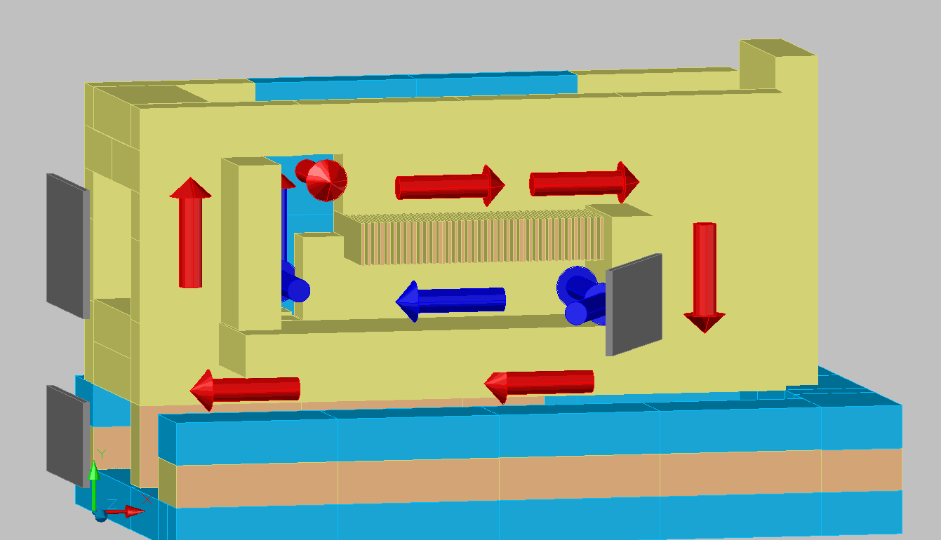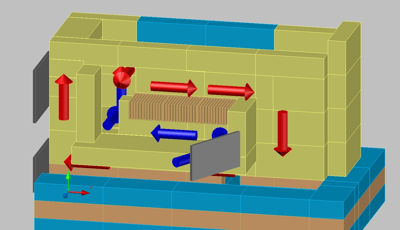 Я хочу максимально удлинить ход по которому встречными потоками течет приточный воздух по низу и горючий пиролизный дым по верху, таким образом добиться полного сгорания. Для этого разделю этот канал на верхний и нижний отсек, горизонтальным перекрытием из огнеупорного кирпича, с тонкими вертикальными щелями отверстиями между вертикальными пластинками, для частичного смешивания нижнего и верхнего потоков.