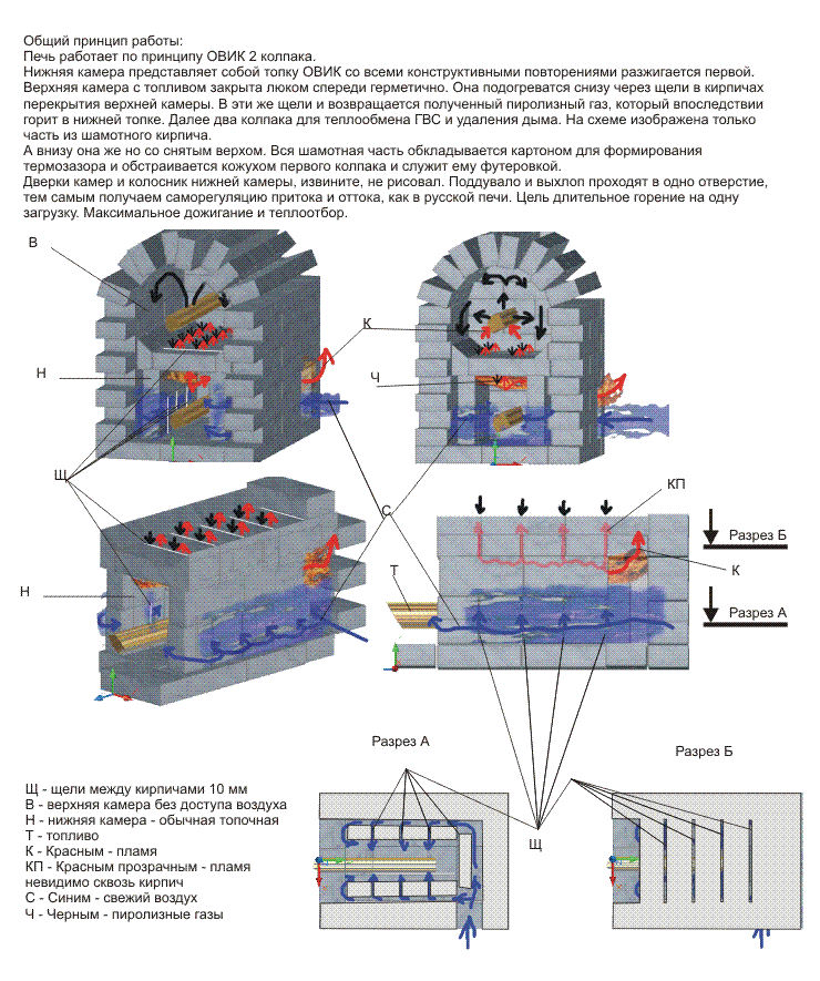 Движение газов в щелях между верхней и нижней камерами на этапе розжига будет снизу вверх для теплого воздуха. А после выхода на пиролизацию избыток давления пиролизных газов будет втискиваться только вниз в то время как вверх будет передаваться инфракрасное тепло раскаленного кирпича. Следует верхнюю камеру делать герметичной во избежание дымления, где не нужно.